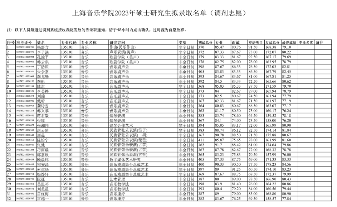 依据《上海音乐学院2023年硕士研究生招生复试及录取工作办法》,经上音硕士研究生招生工作领导小组2023年4月13日会议审定,拟录取以下人员为上海音乐学院2023级硕士研究生(不含推免生、港澳台研究生、留学生研究生)。