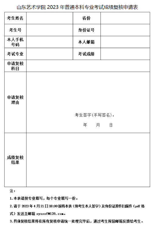 考生如对本人专业成绩有异议,可填写《山东艺术学院2023年普通本科专业考试成绩复核申请表》,于2023年4月21日18:00前将申请表(考生本人亲笔签名)及身份证原件扫描件(pdf格式)打包发送至邮箱syzsxf@126.com,邮件主题统一命名为:2023年成绩复核申请+考生姓名。申请复核时间4月17日13:00-21日18:00,逾期不再受理。