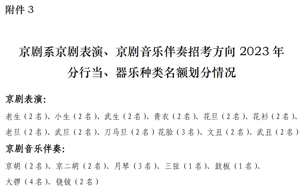 四、京剧系京剧表演、京剧音乐伴奏招考方向2023年分行当、器乐种类名额划分情况见附件3。