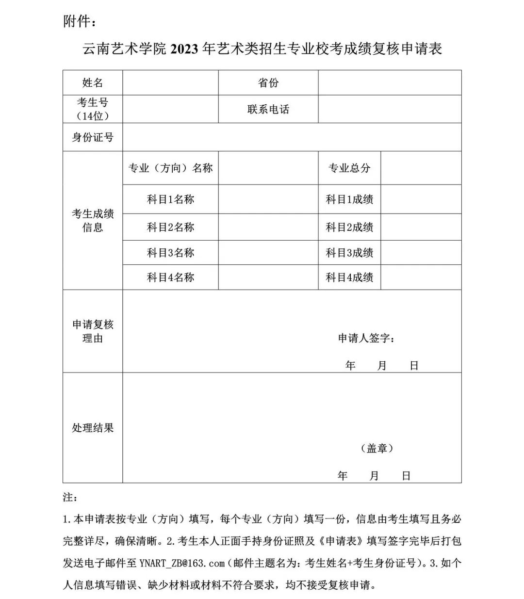 附件.云南艺术学院2023年艺术类招生专业校考成绩复核申请表