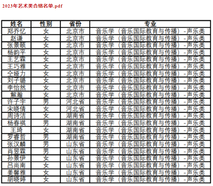 按照教育部要求,现对我校2023年艺术类音乐学(音乐国际教育与传播)专业合格名单、认定原则和分省计划进行公示。考生可登录小艺帮APP,进入考试结果页面,查询个人成绩和省内排名。公示期为七个工作日(即日起至5月17日),如有异议请在公示期内与我校取得联系。联系电话:010-82303943。