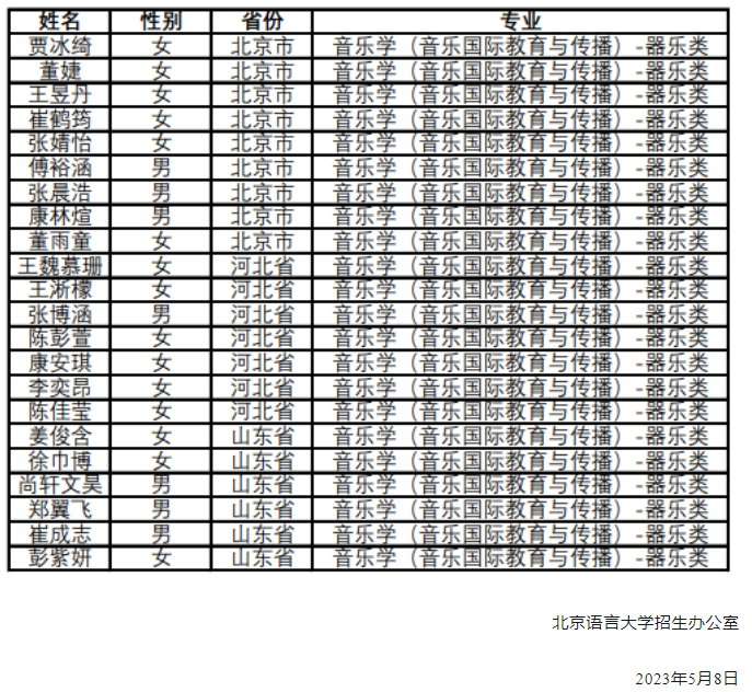 北京语言大学2023年音乐学认定原则和分省计划