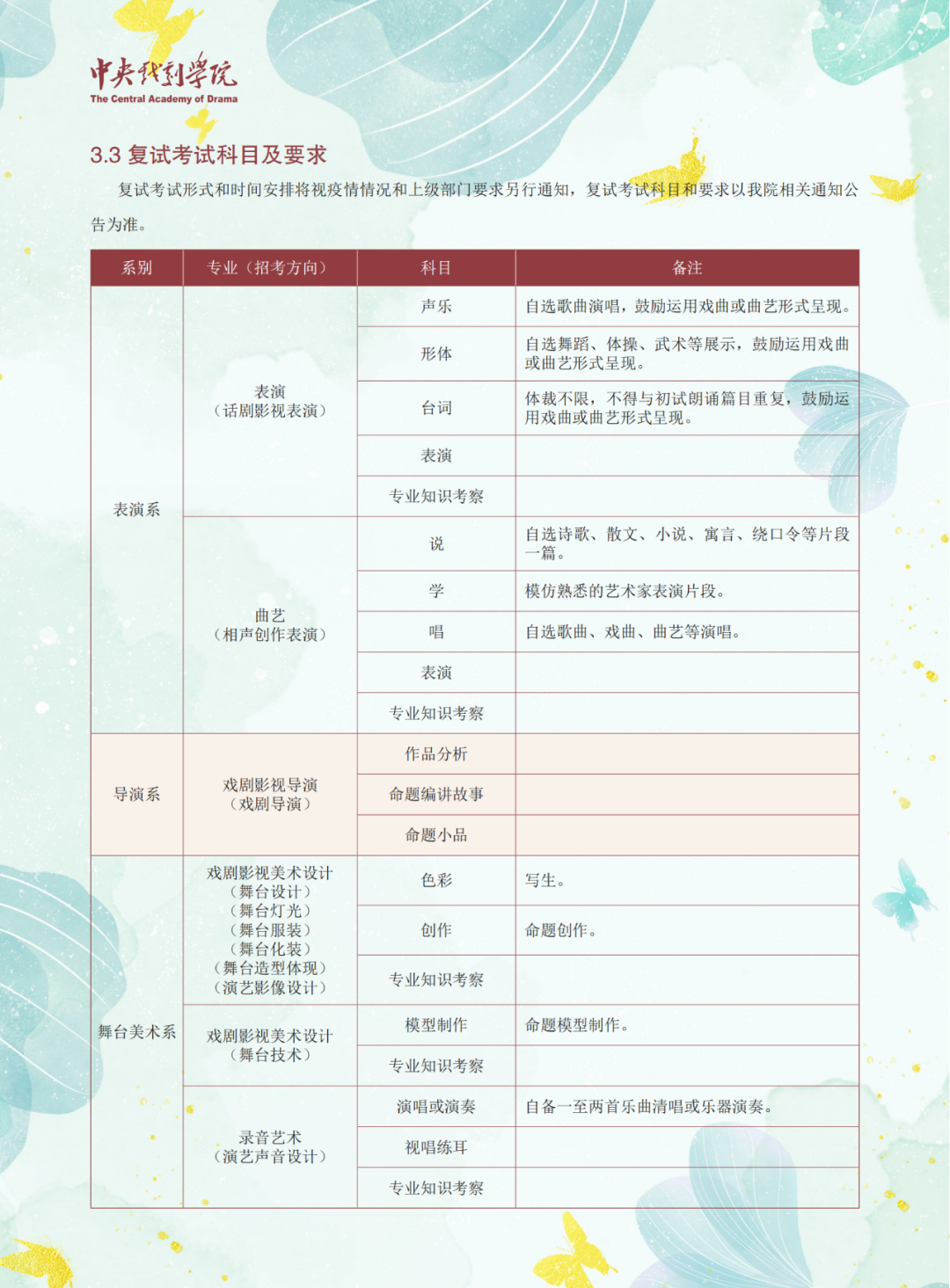 对比初试内容的细致化调整,中央戏剧学院23年的复试考核,在各专业考试项目不变的情况下,对各专业的复试内容的考核采取更加具有专业化和学校特色的内容。