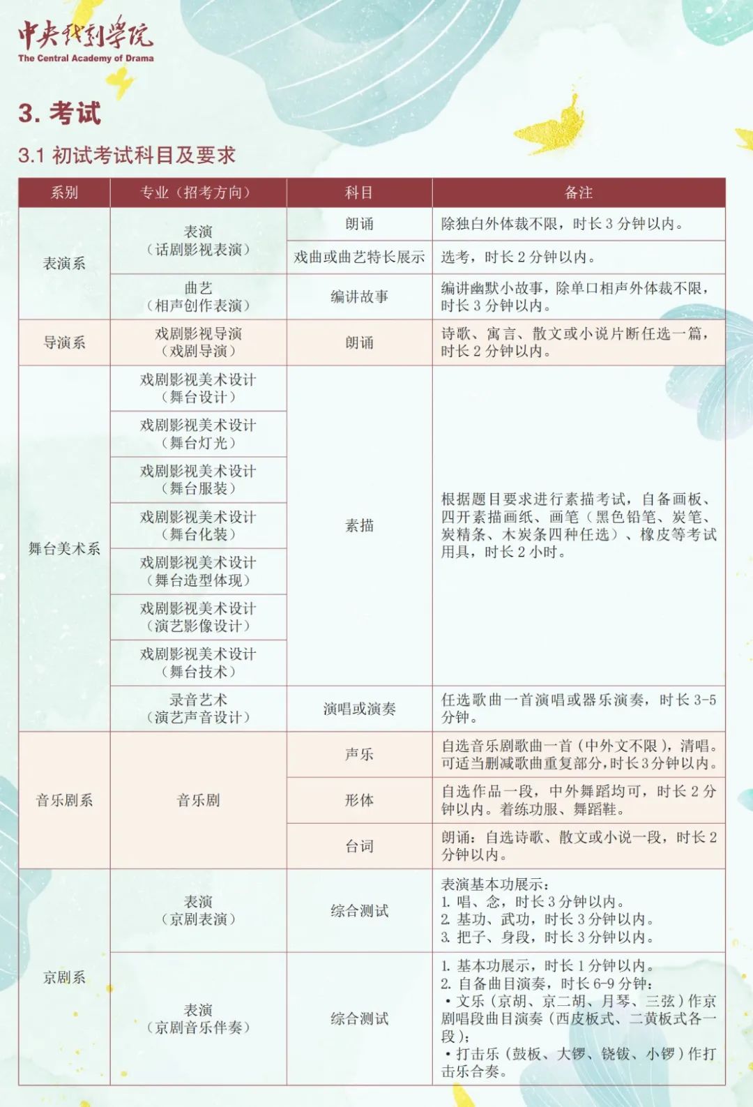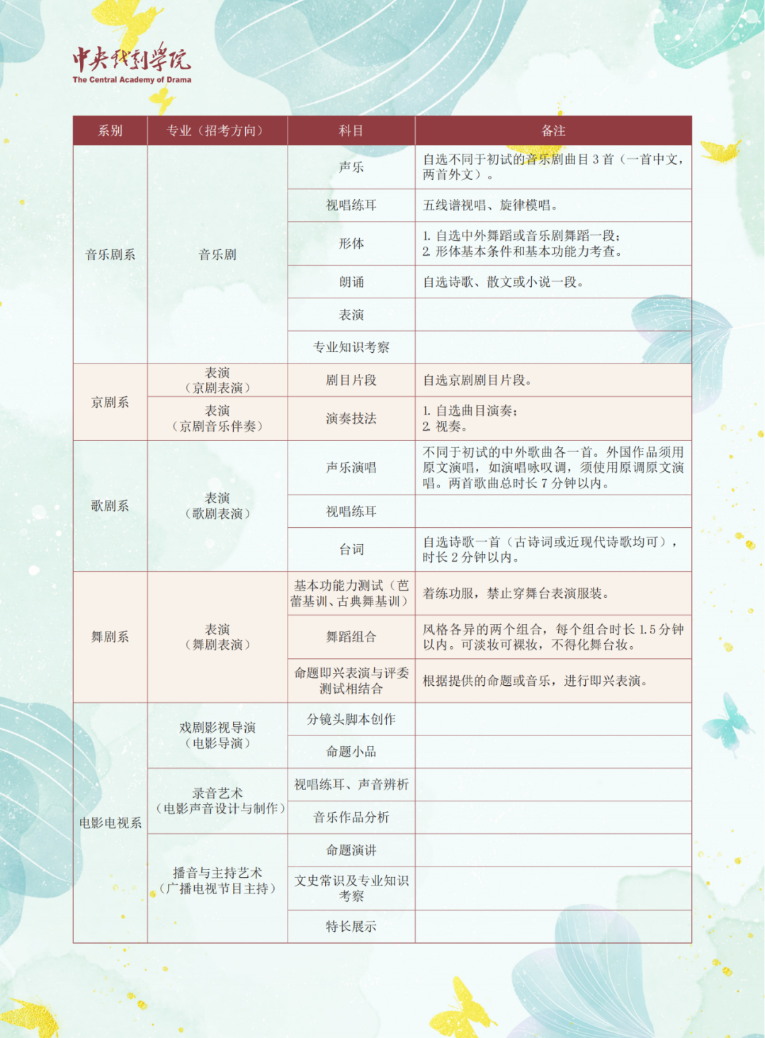 在音乐剧系(音乐剧),增加考试时间2分钟。考试科目中形体方面,增加着练功服、舞蹈鞋的选项,对考生整体的素质进行考察。并增加考试科目--台词,朗诵自选诗歌、散文和小说一段,时间要求2分钟以内。