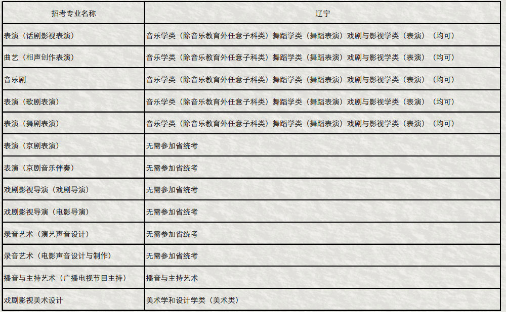 1.对比央音与国音校考仅可报考一个专业的情况,中央戏剧学院可以同时报考3个专业。并且对比上音、国音参加校考不设置是否通过统考的合格线,中戏在专业报考要求上,对河北、山西、内蒙古、上海、浙江、江苏等多省有参加统考的专业要求,其中录音艺术专业每个省份都有不同的专业要求:报考统考的科目类别。例如中戏23年在辽宁省的音乐专业报考上表演(话剧影视表演)、曲艺(相声创作表演)、音乐剧、表演(歌剧表演)、表演(舞剧表演)统一要求音乐学类除音乐教育外任意子科类均可报考。