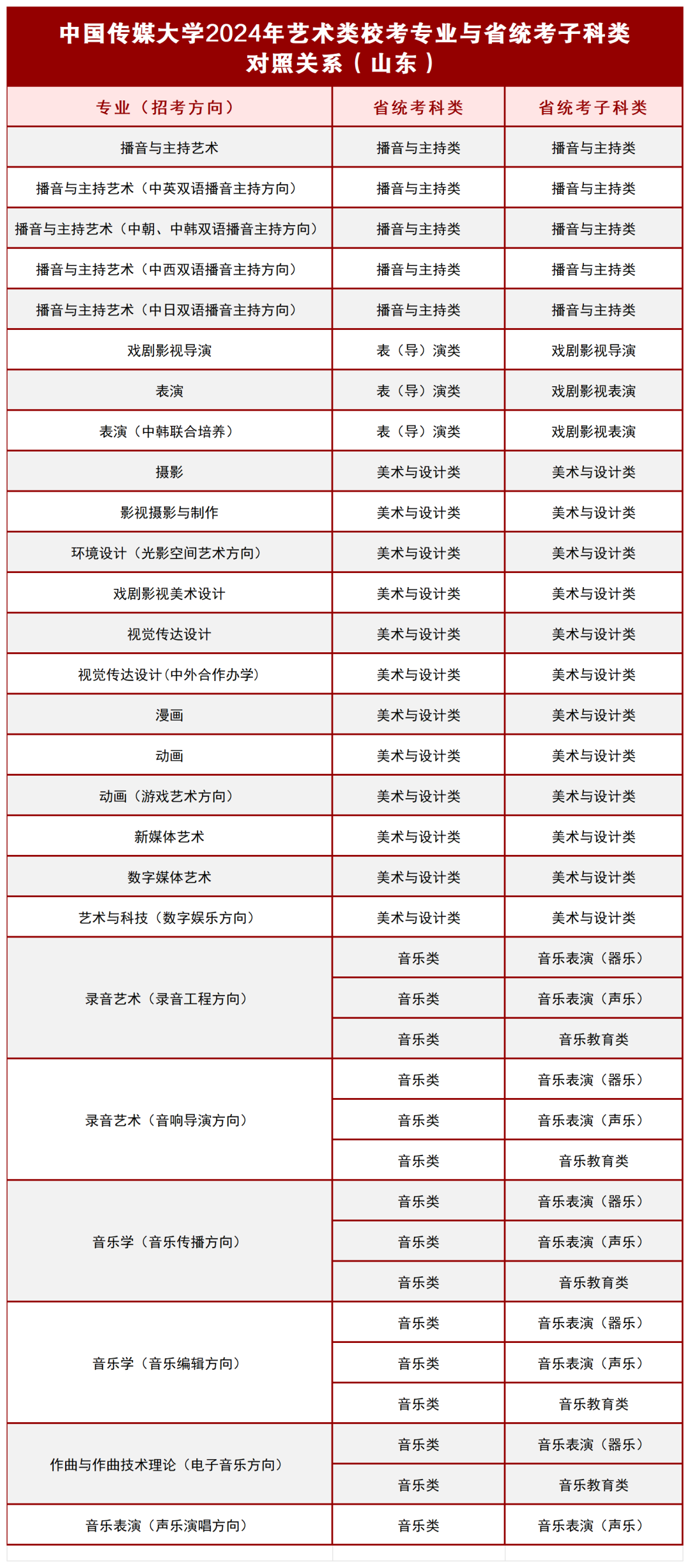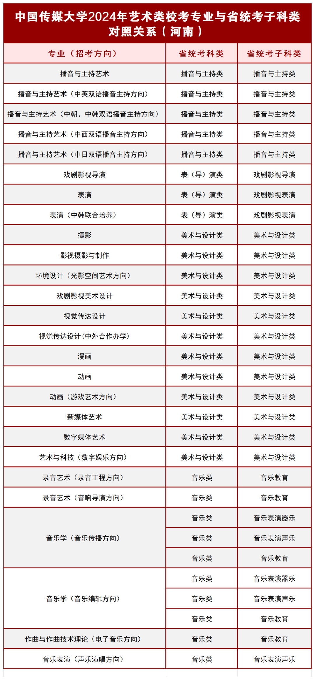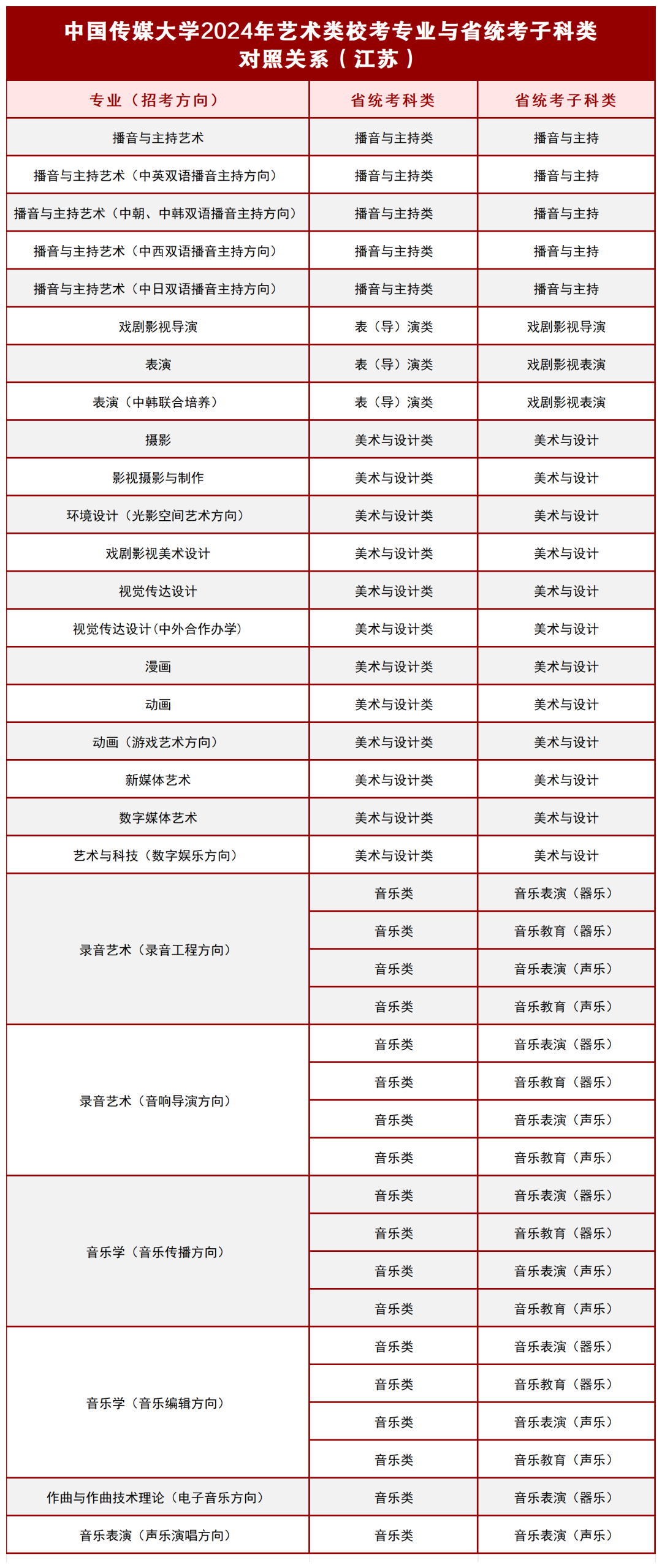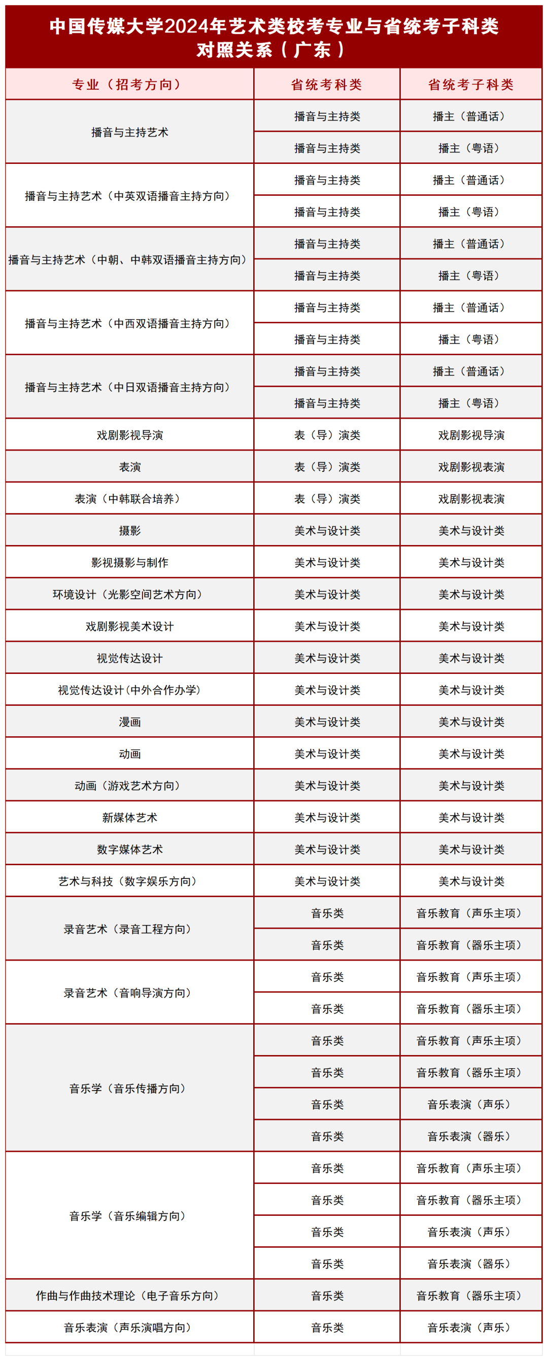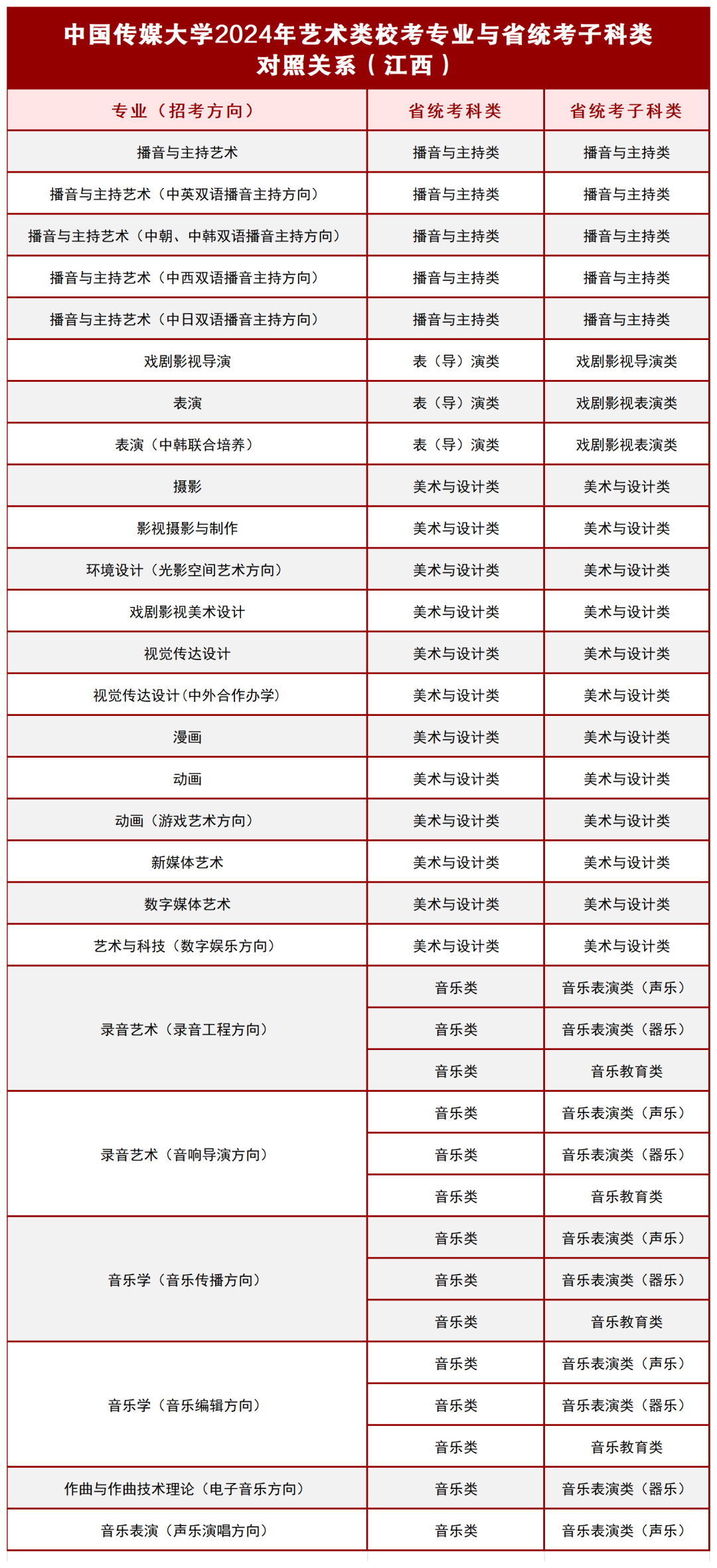 中国传媒大学2024年艺术类校考专业与省统考子科类对照关系