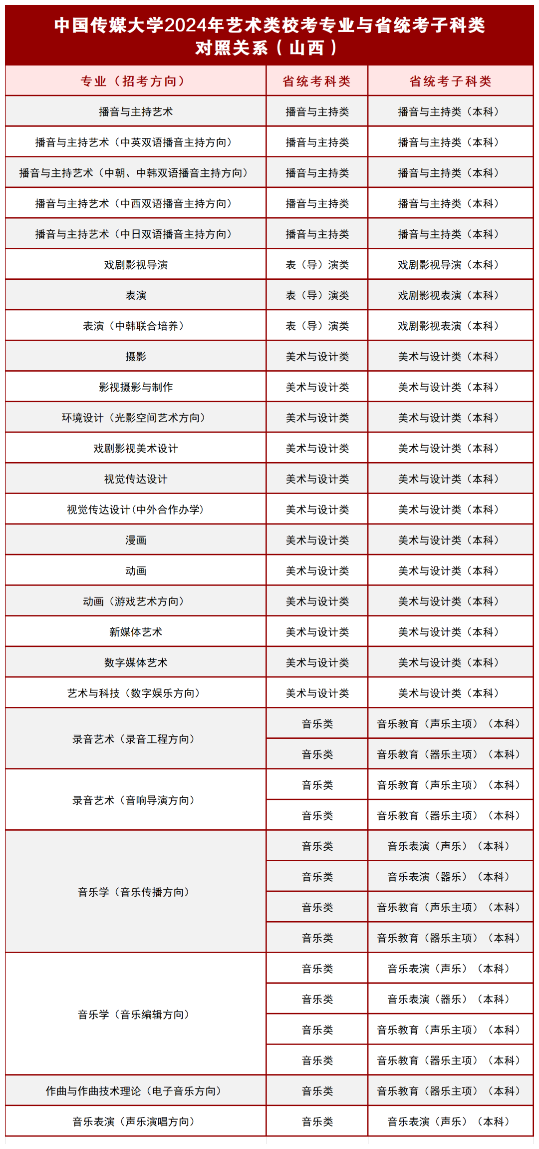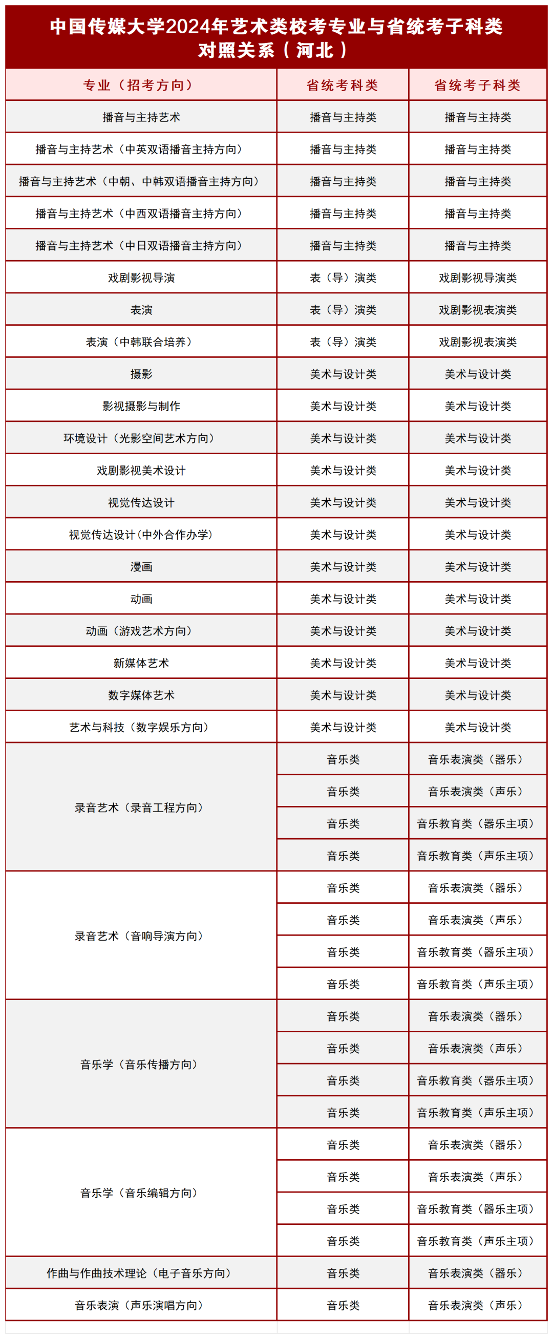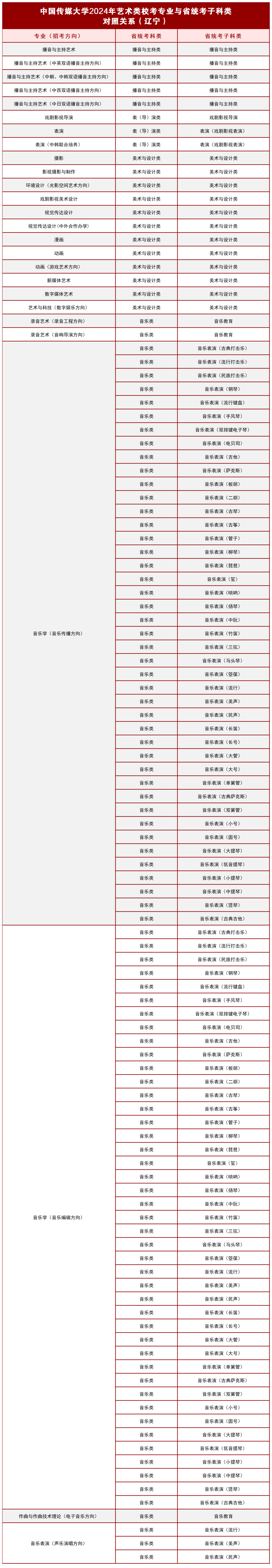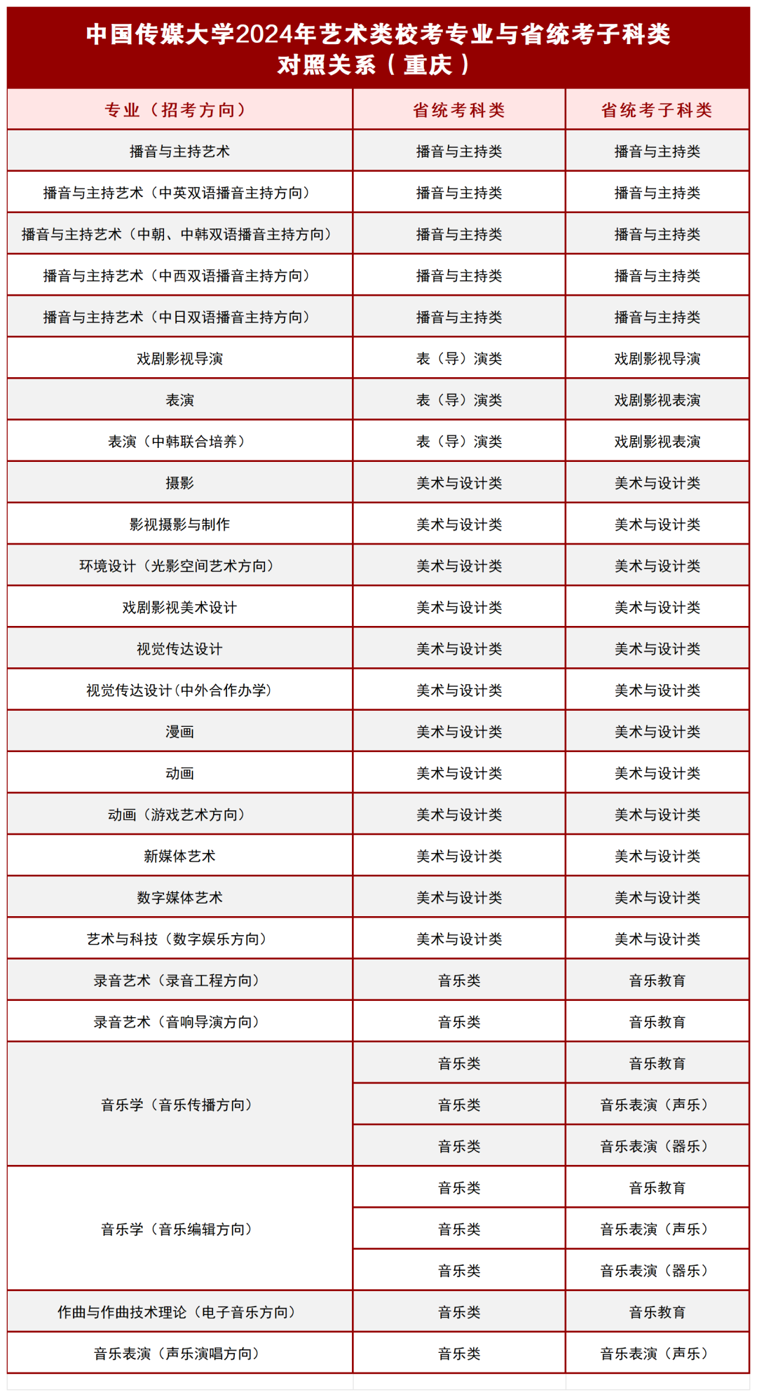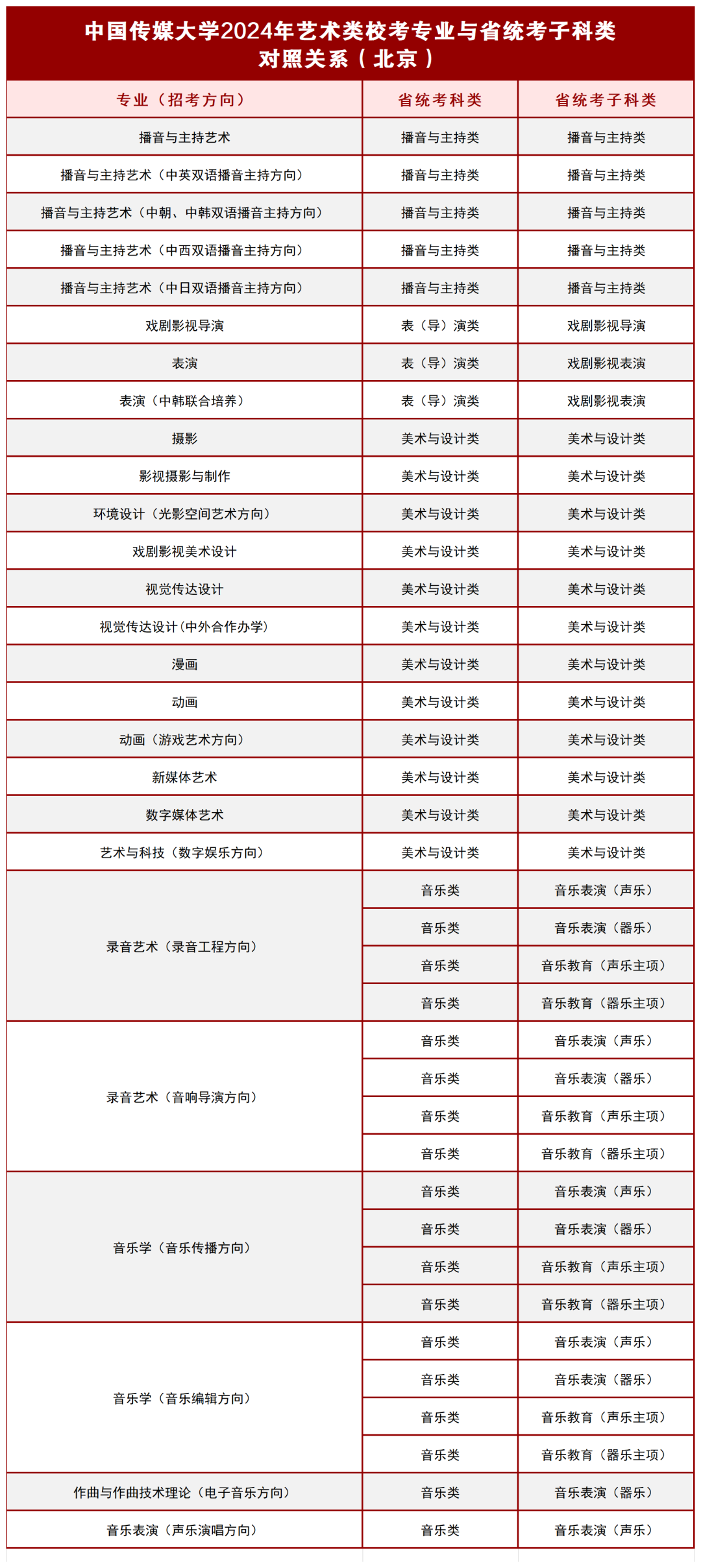 中国传媒大学2024年艺术类校考专业与省统考子科类对照关系
