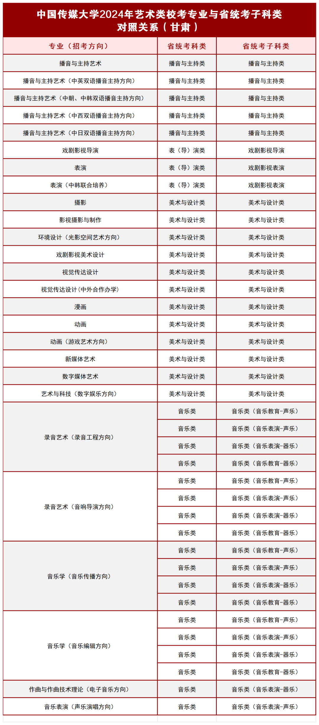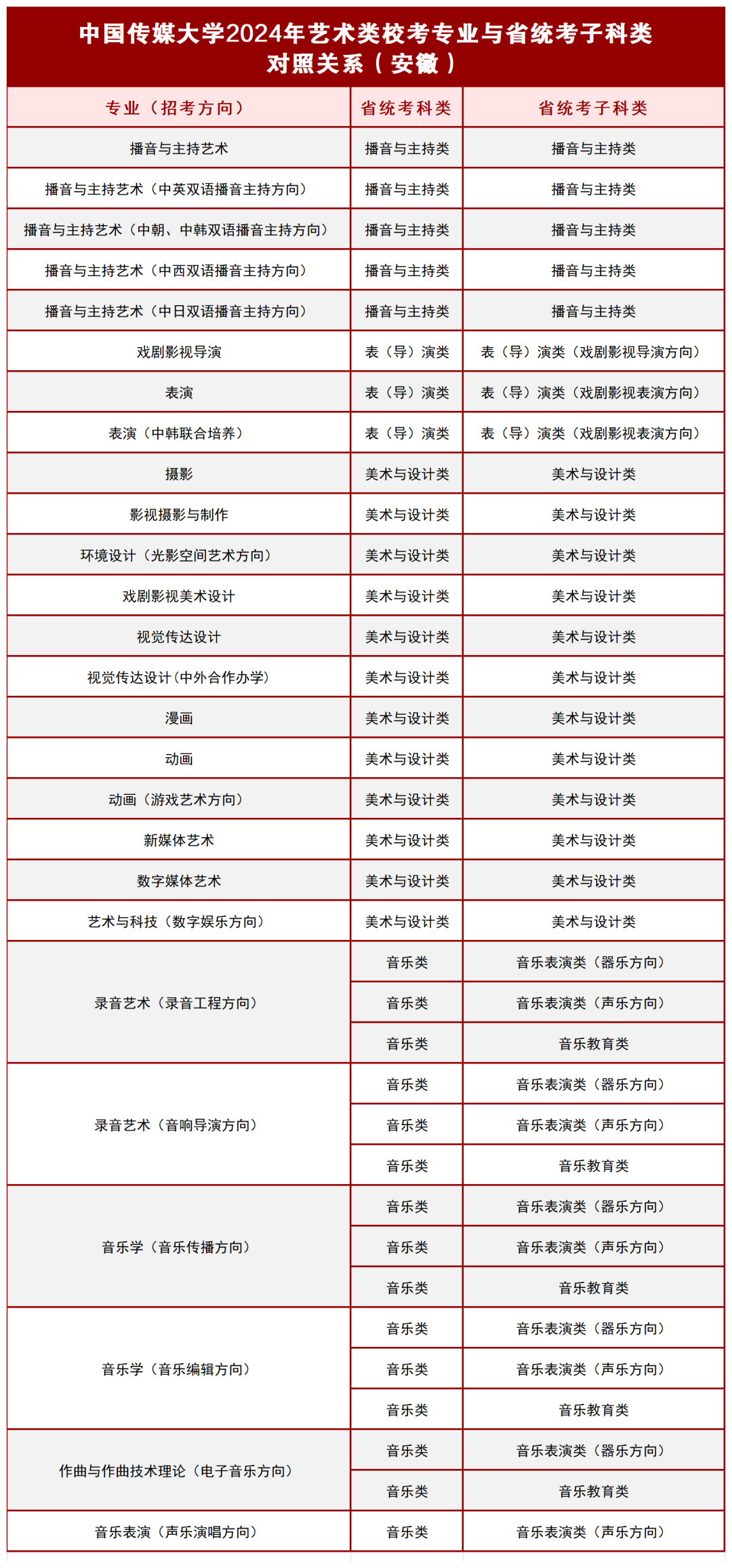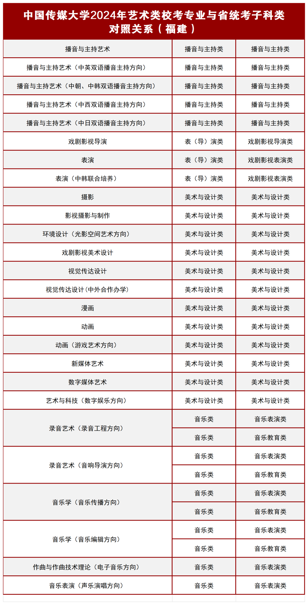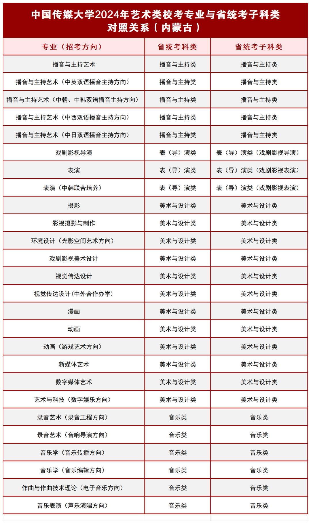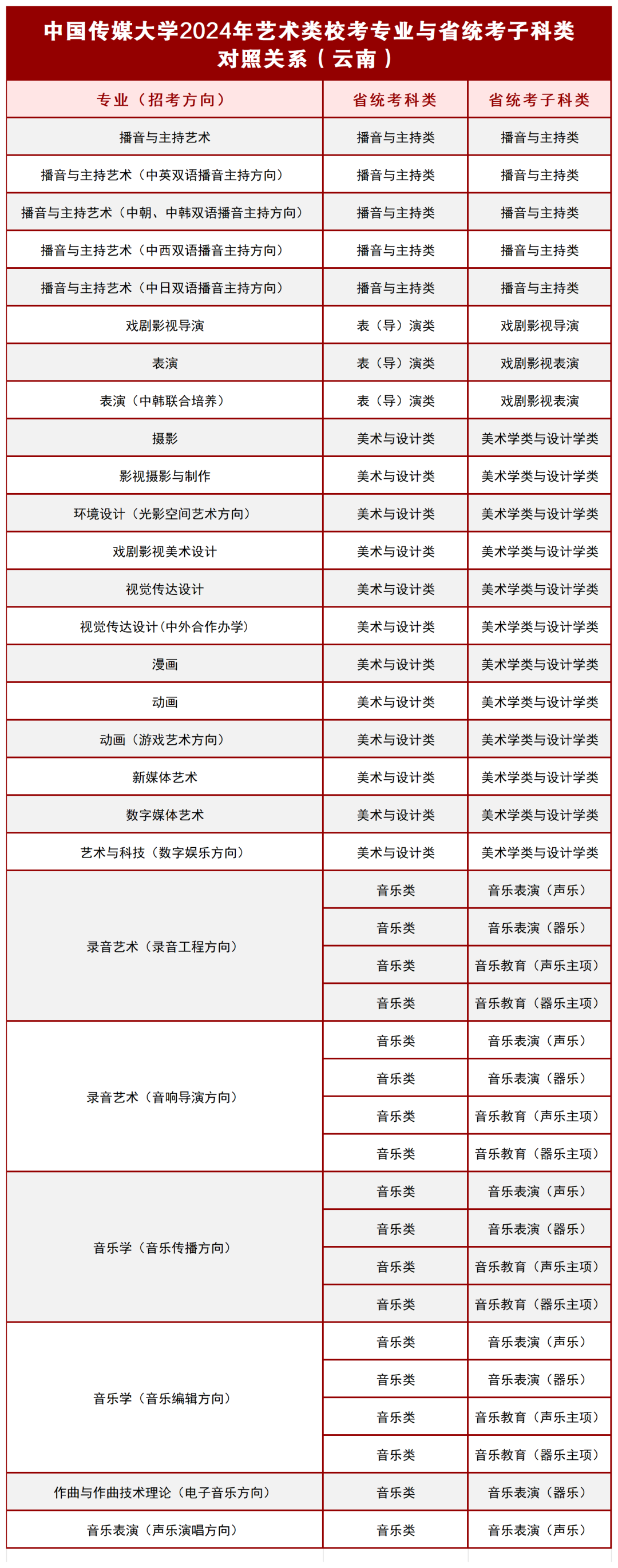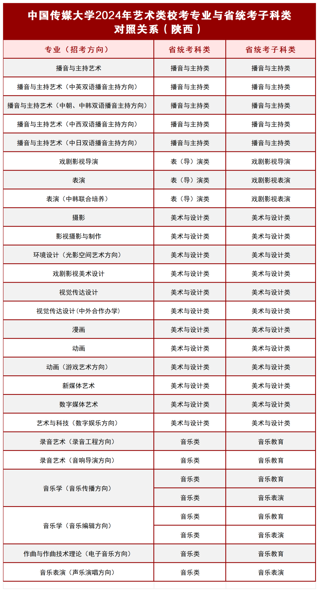 中国传媒大学2024年艺术类校考专业与省统考子科类对照关系