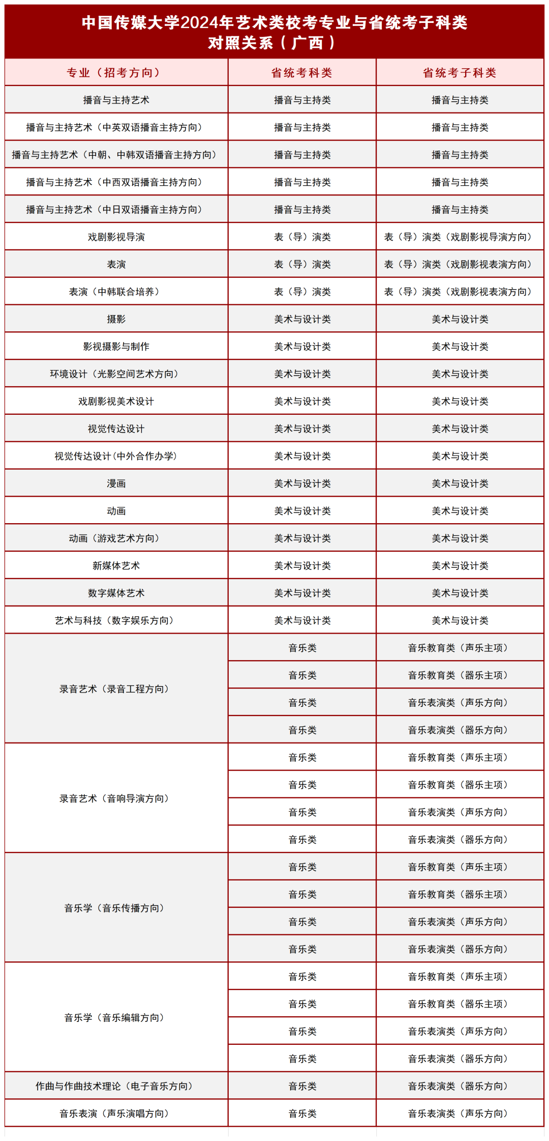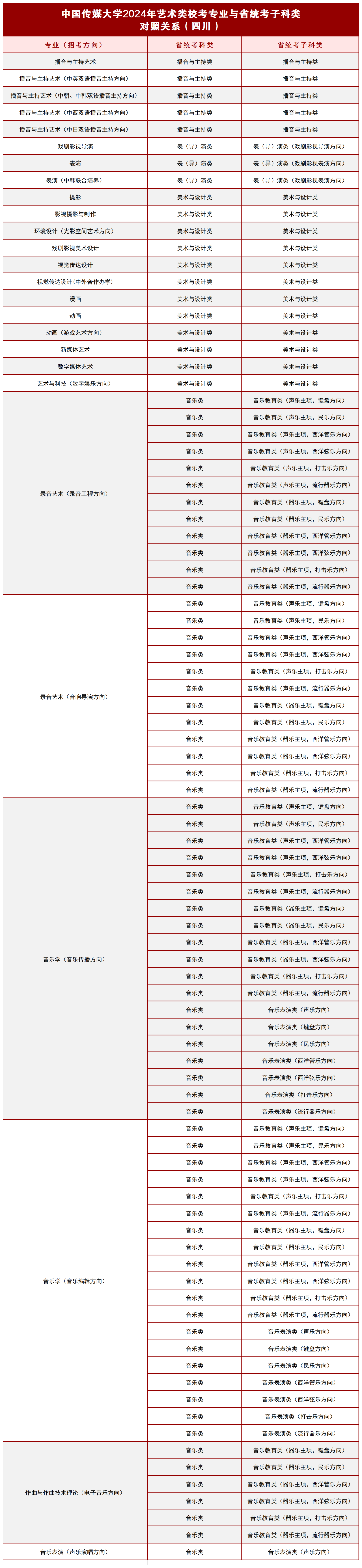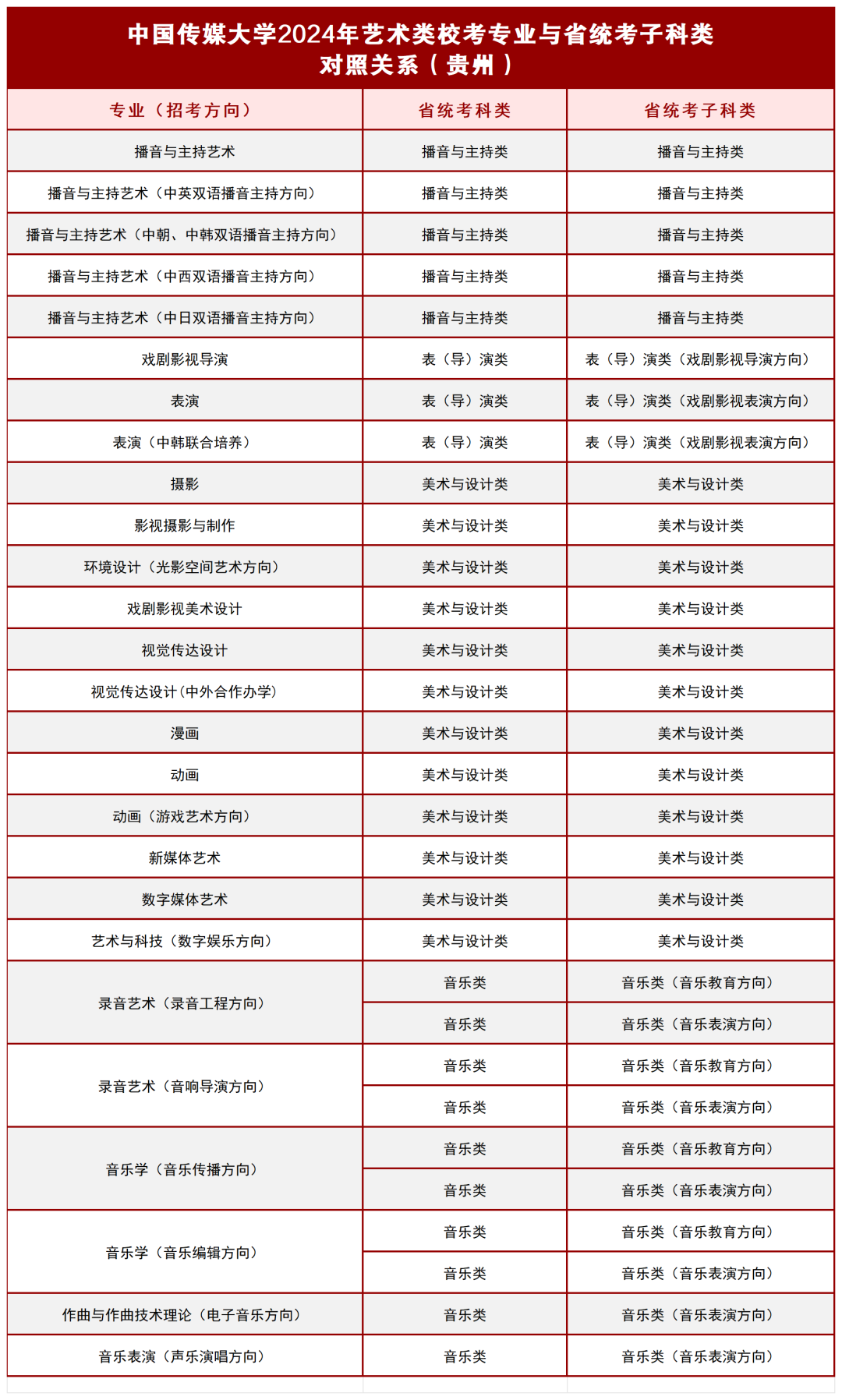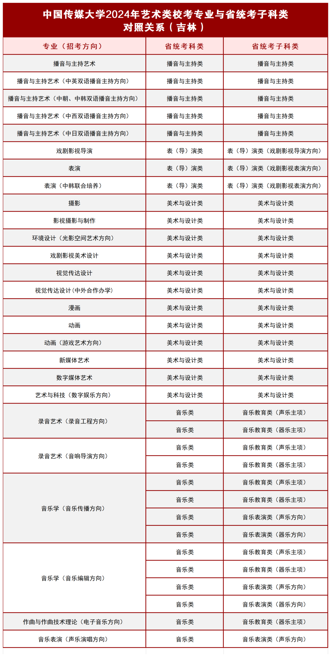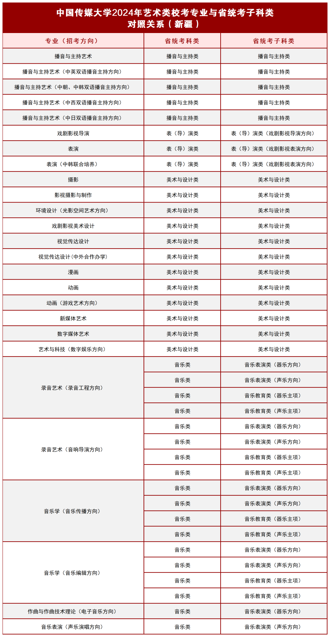 中国传媒大学2024年艺术类校考专业与省统考子科类对照关系