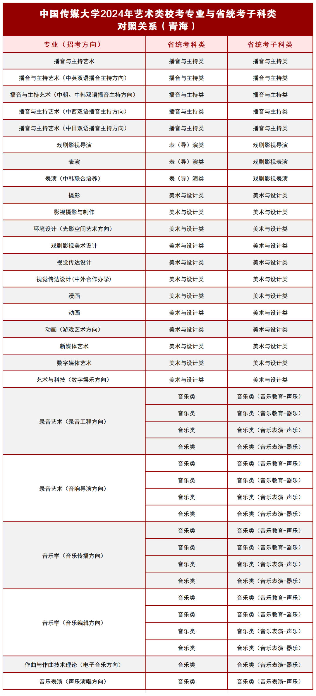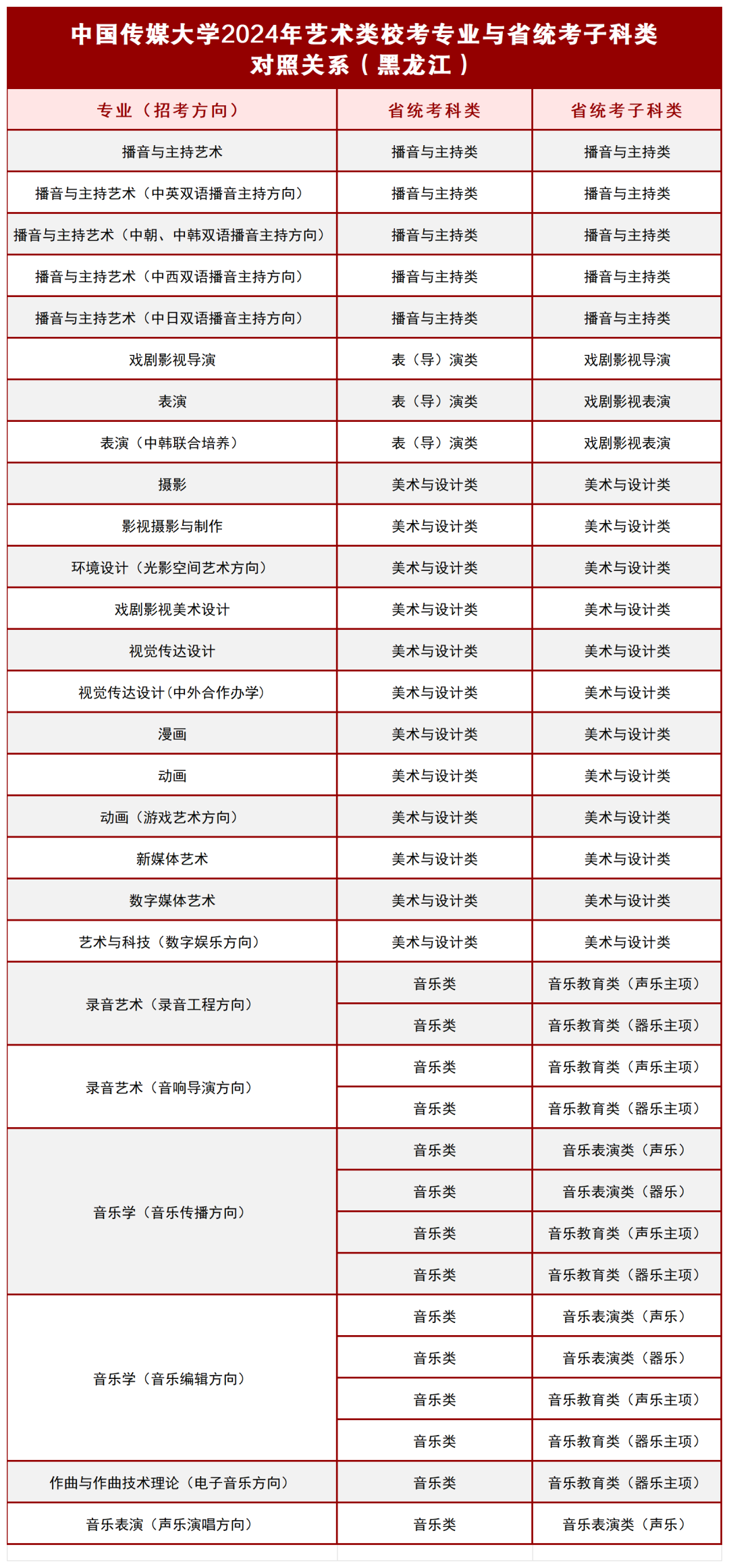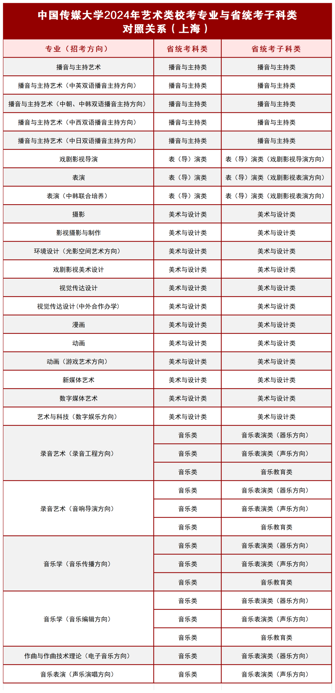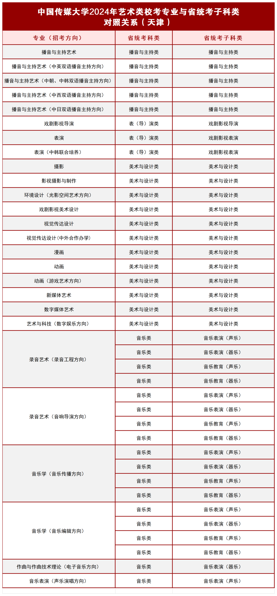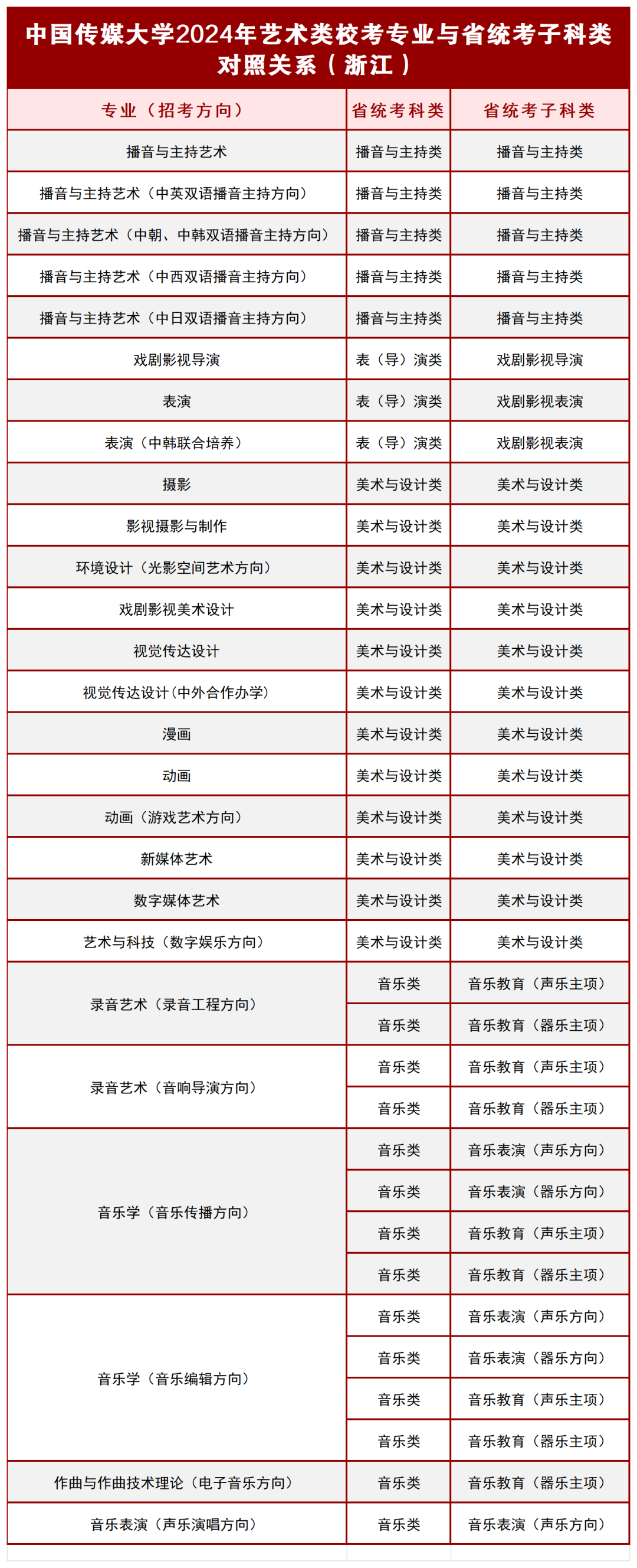 中国传媒大学2024年艺术类校考专业与省统考子科类对照关系