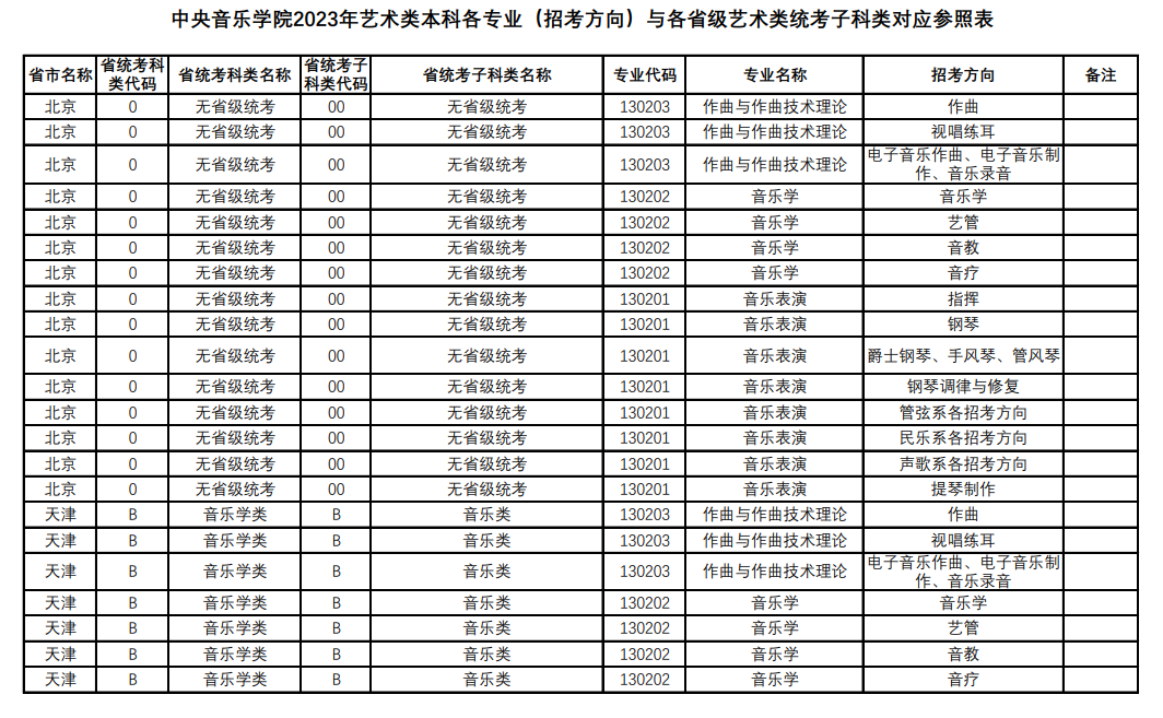 今年北京市首次举行艺术类统考,在之后全国可能也会进入统考时代。相比于2023年北京市、陕西省考生想要报考中央音乐学院必须要求省统考成绩合格才能报考,如果没有参加省统考或者省统考没有达到专业合格线的要求,即便拿到了中央音乐学院的校考合格证也不以录取。在之前我们也是有说过的中国音乐学院也是如此的,在今年也是要实现全统考的方式。即使考生拿到了相关学院的证书,如果你的统考成绩没有达标或者不合格,那么学院也是不会给你发录取通知书的。有表格