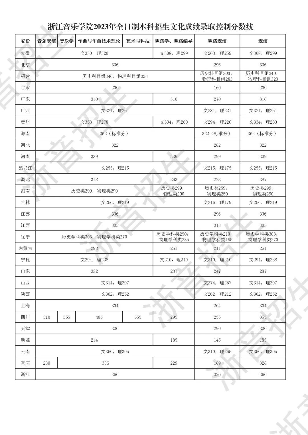 浙江音乐学院2023年全日制本科招生文化成绩录取控制分数线