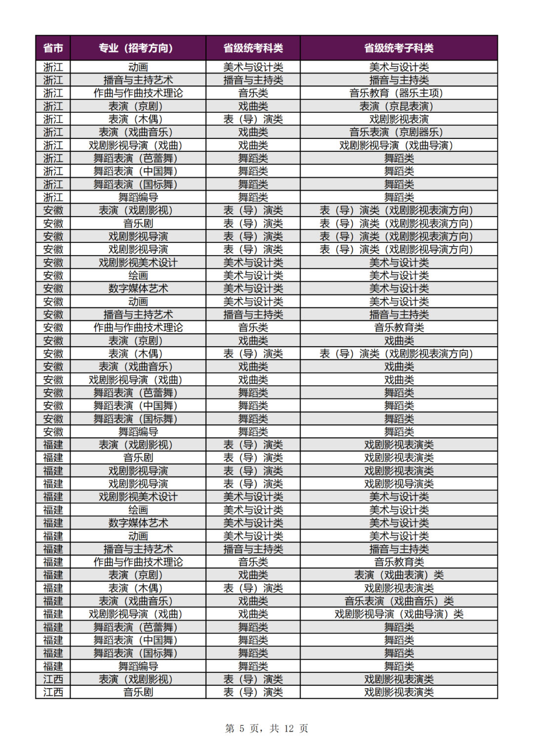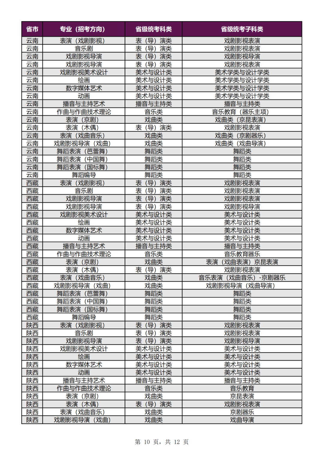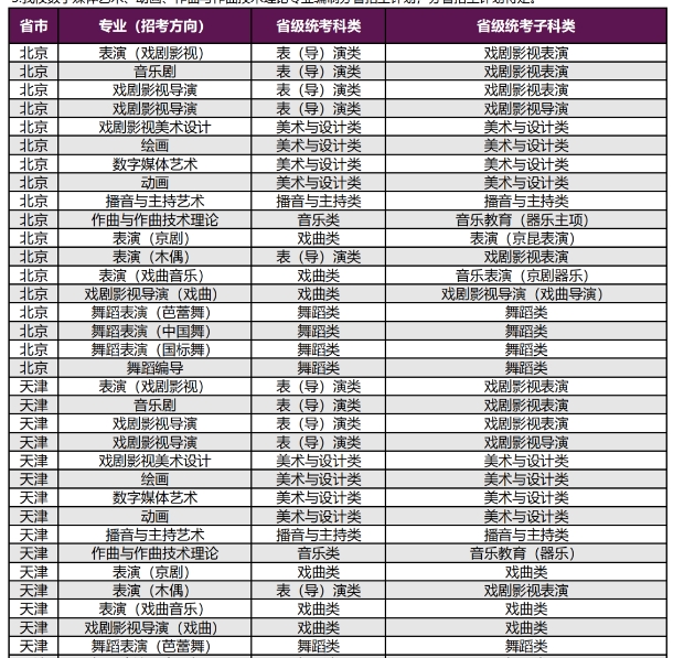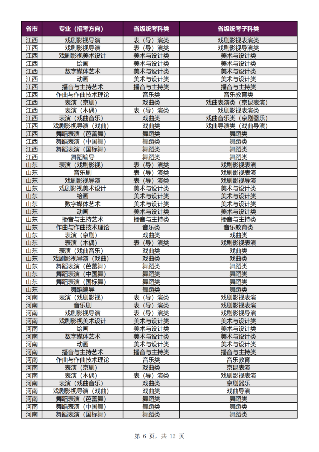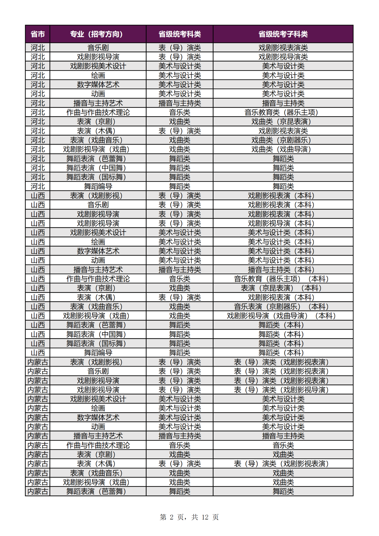 上海戏剧学院2024年本科招生专业 (招考方向) 与各省级统考子科类对应表