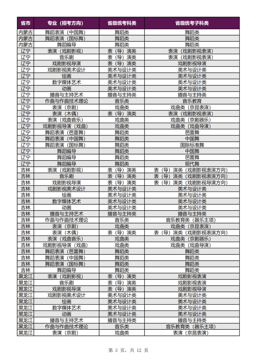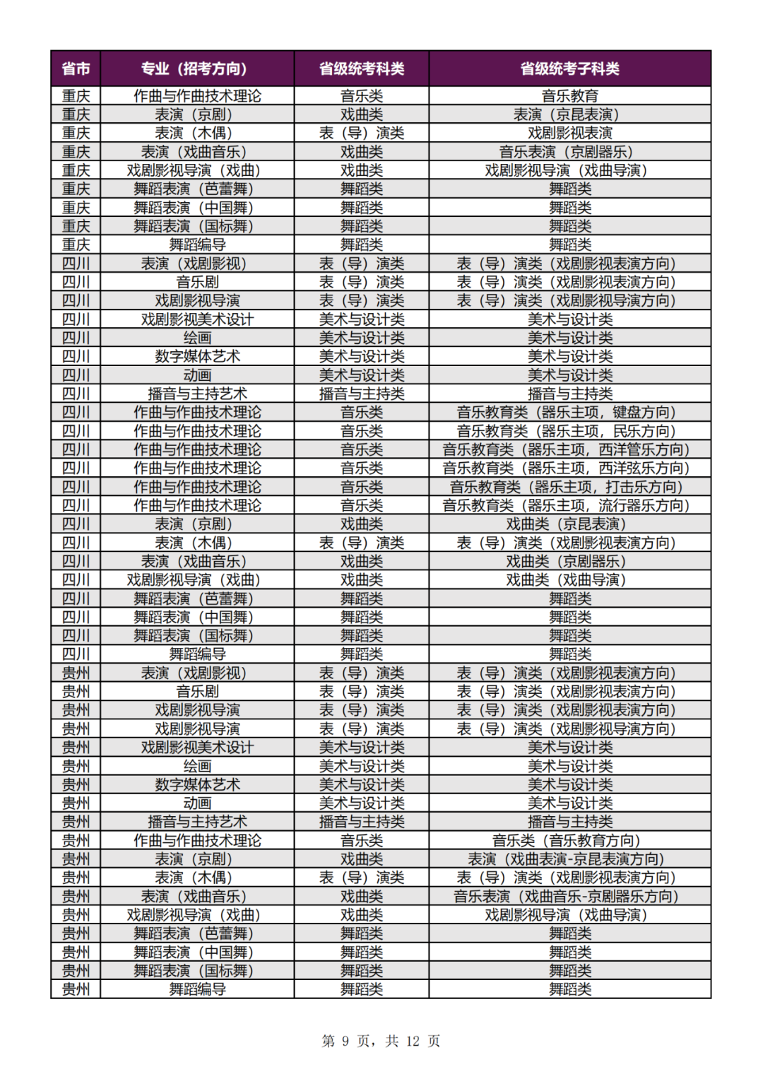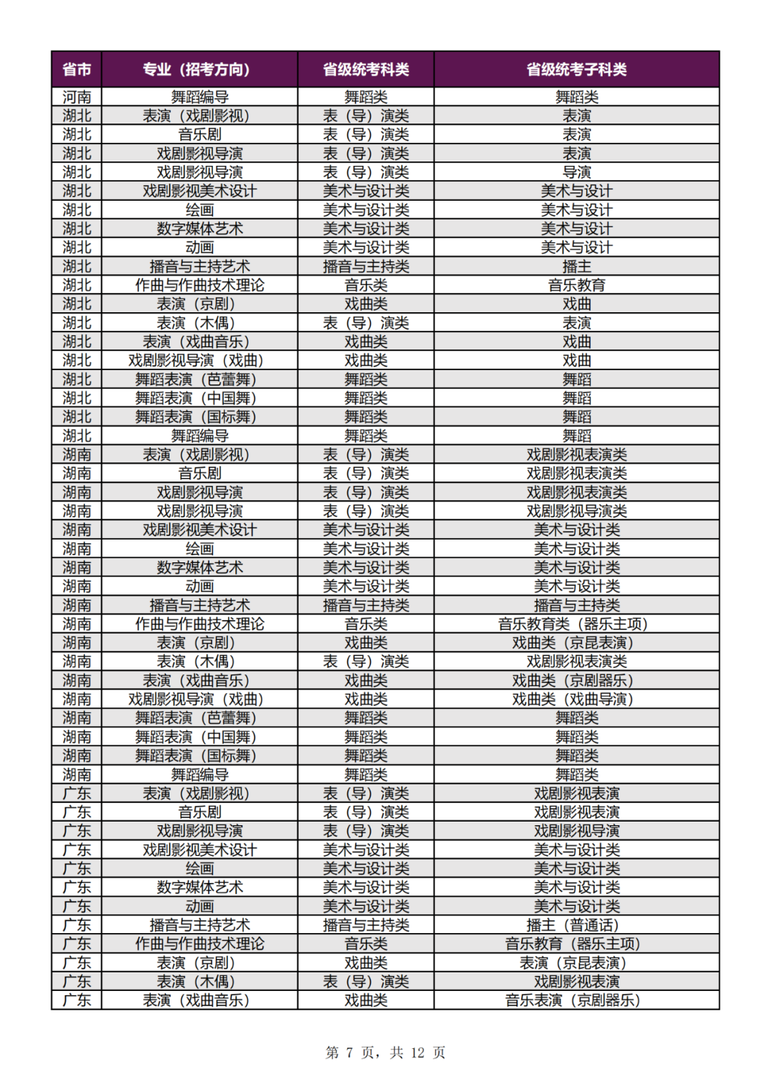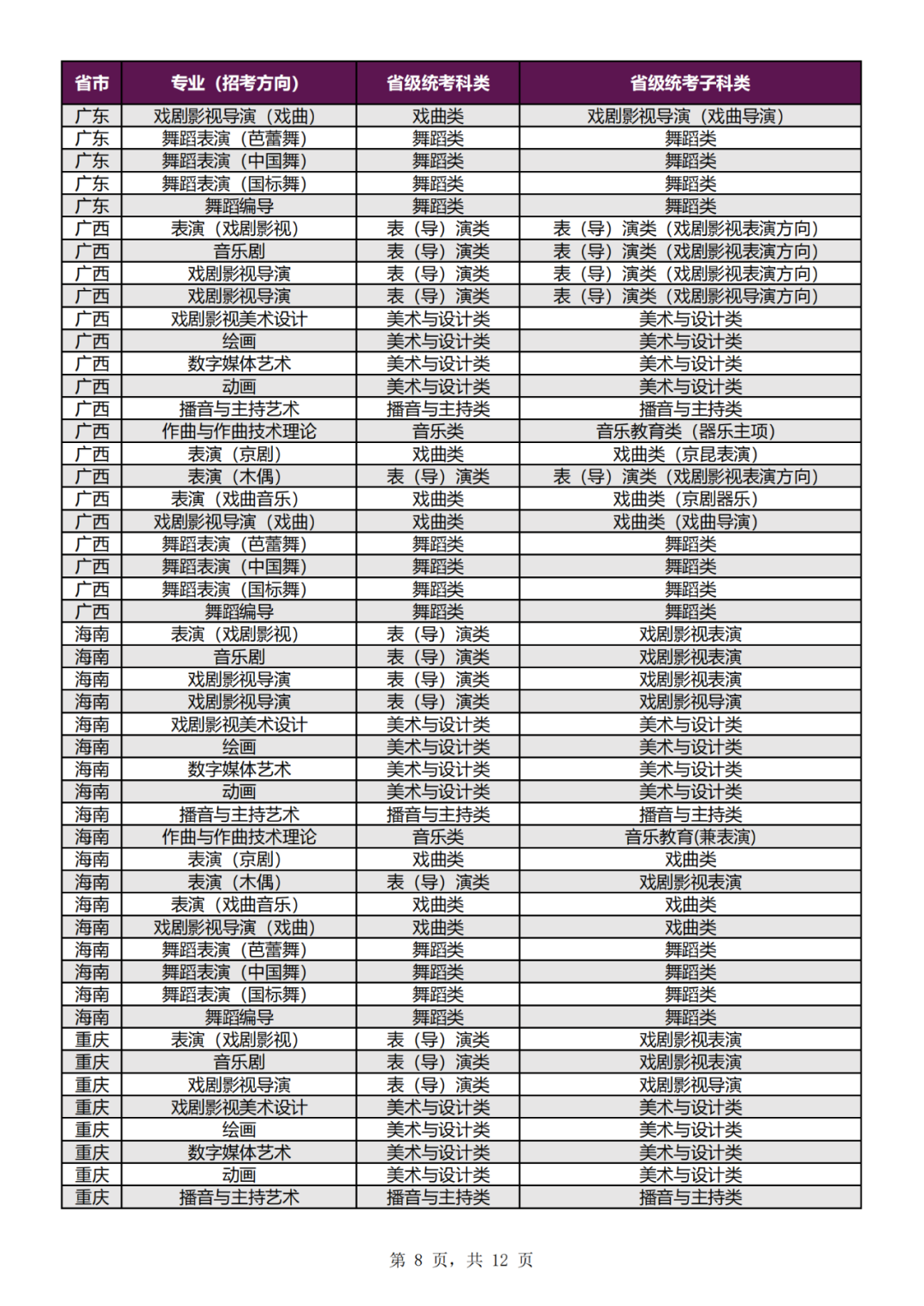 上海戏剧学院2024年本科招生专业 (招考方向) 与各省级统考子科类对应表