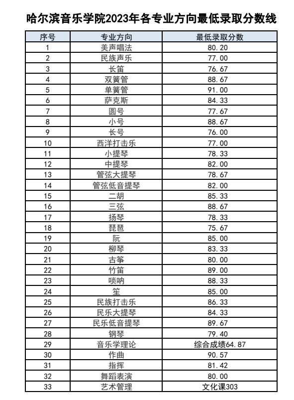 哈尔滨音乐学院2023年各专业方向最低录取分数线