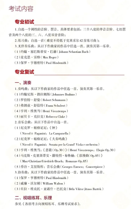 中提琴专业:初试复试考试曲目库调整,23年考试内容初试为单音和琶音+两首练习曲+巴赫乐章;复试抽选协奏曲、奏鸣曲或古典协奏曲等。24年初试考试内容调整为自选音阶、琶音、练习曲、无伴奏乐曲,复试为自选奏鸣曲、自选音乐会曲、协奏曲任选,一共三首曲目。