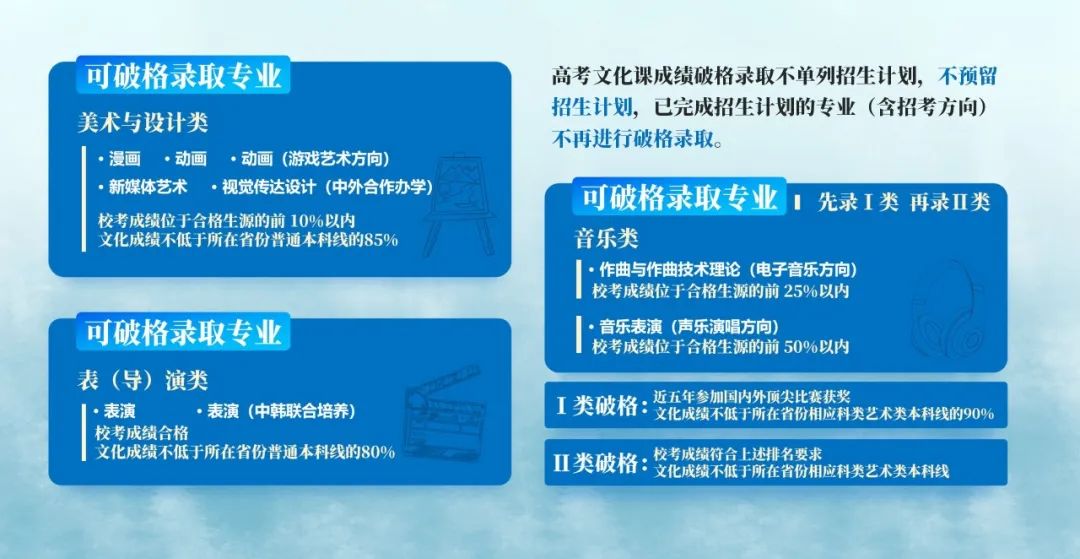 对于部分艺术类校考专业(含招考方向),我校在按照普通本科线和校考成绩排名完成录取后,在考生所报专业(含招考方向)录取名额未满的情况下,采用破格录取办法。