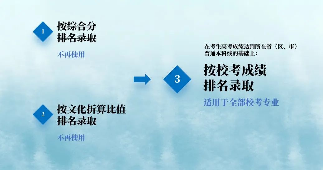 往年校考中使用的文化折算比值排名录取、综合分排名录取的方式,今年不再使用。