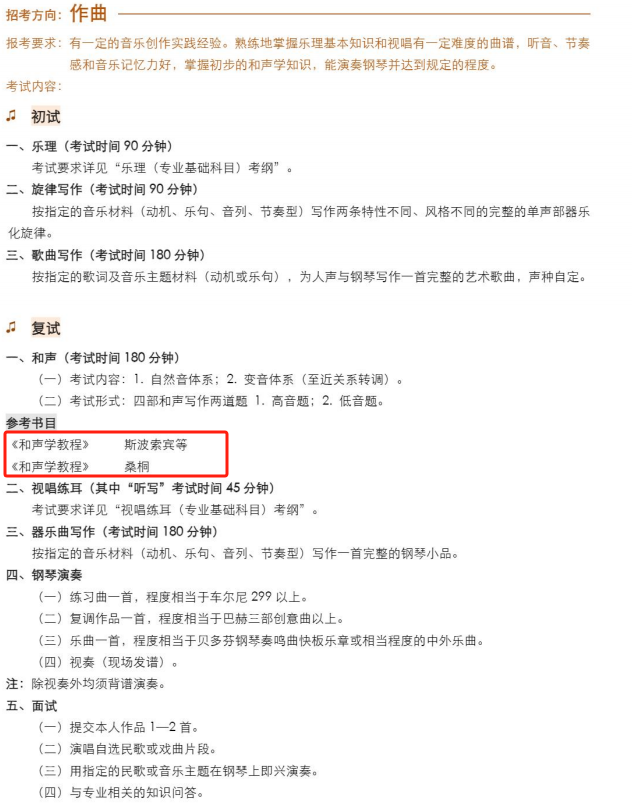 第十七,作曲与作曲基础理论专业调整考试书籍。民族音乐作曲、视唱练耳、作曲与作曲技术理论专业删除《和声学新编》《和声学》两本书,视唱练耳专业增加考试参考书籍《带伴奏视唱曲二》《多音色和声听觉训练教程》《单声部旋律进阶训练教程》。