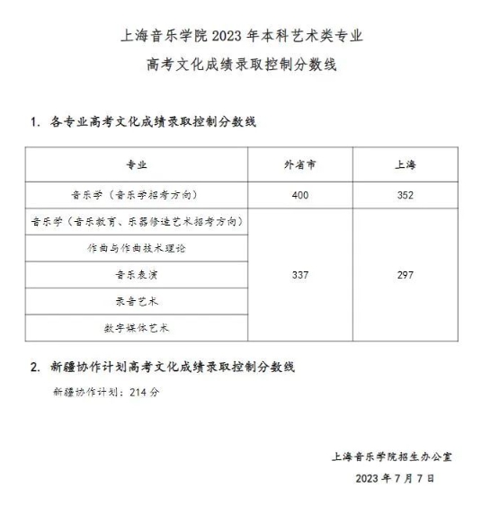 上海音乐学院2023年本科艺术类专业高考文化成绩录取控制分数线