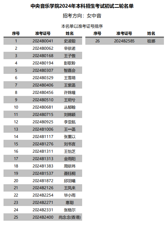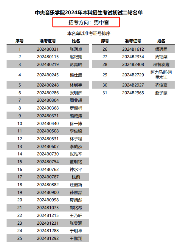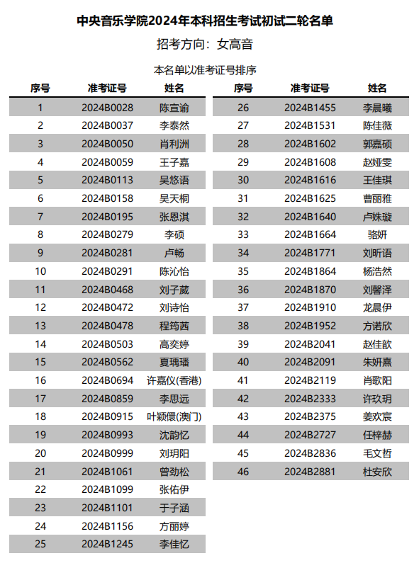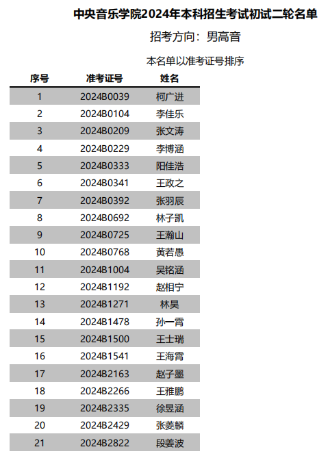 中央音乐学院2024年本科招生声歌系进入初试二轮名单
