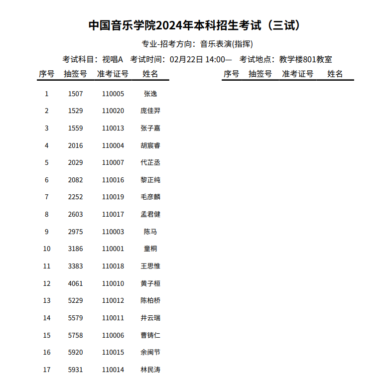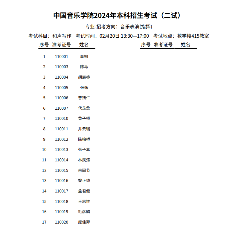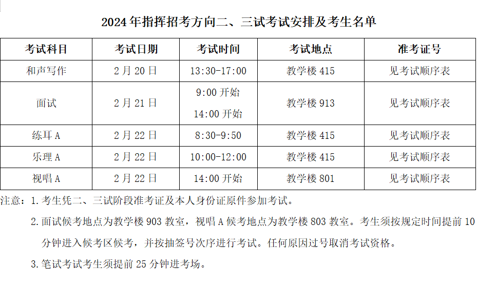 中国音乐学院2024年指挥招考方向二、三试考试安排及考生名单