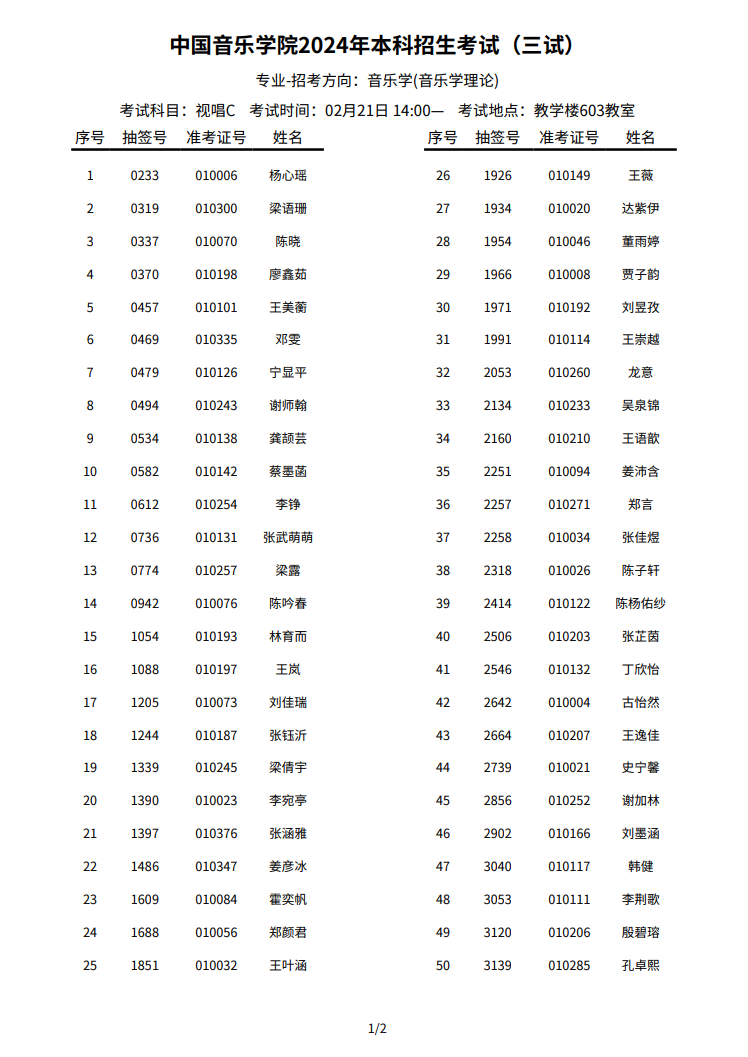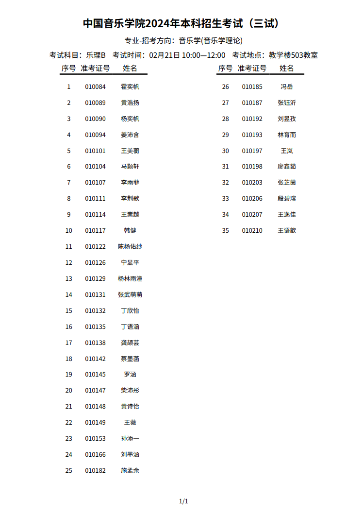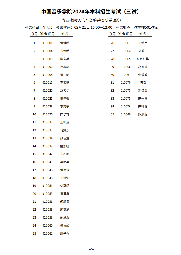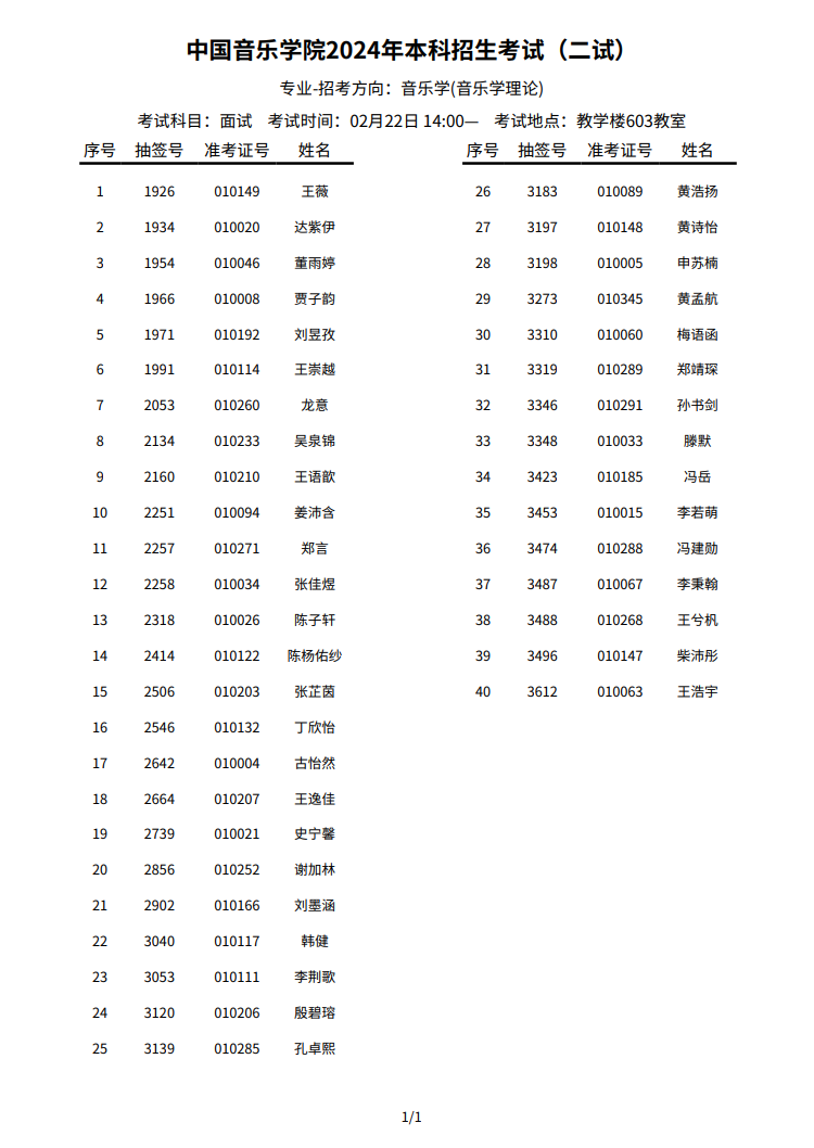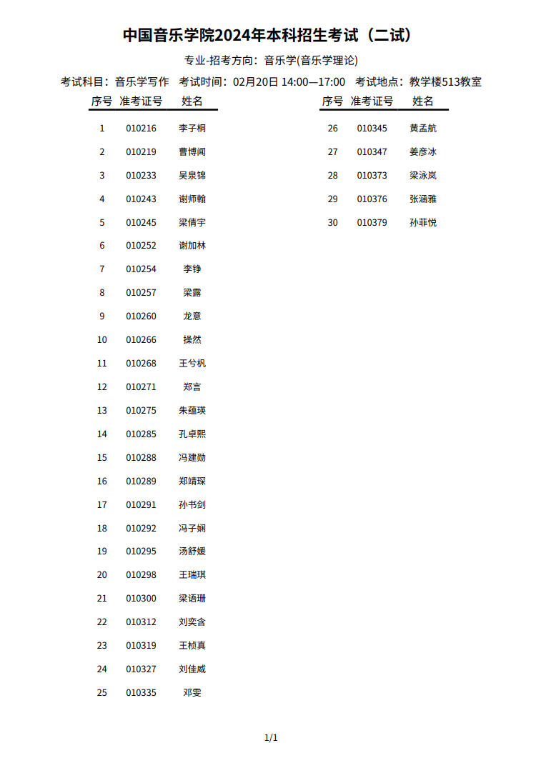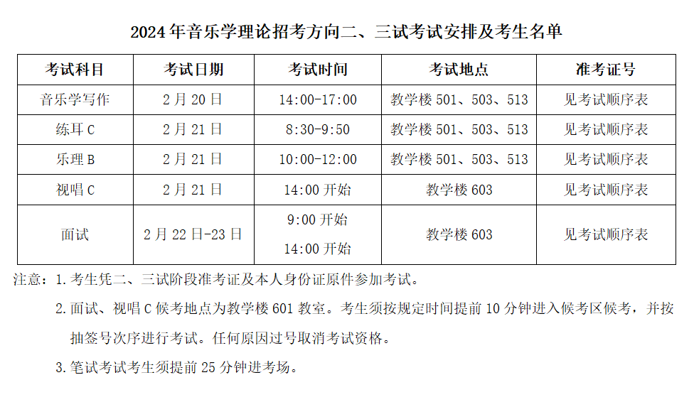 中国音乐学院24年音乐学理论招考方向二、三试考试安排及考生名单