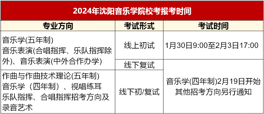 沈阳音乐学院2024年校考考试形式按专业划分两类:初试线上+复试线下和初、复试均线下,各专业考试轮次分为3类: