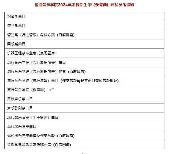 星海音乐学院2024年本科招生考试参考曲目库和参考资料
