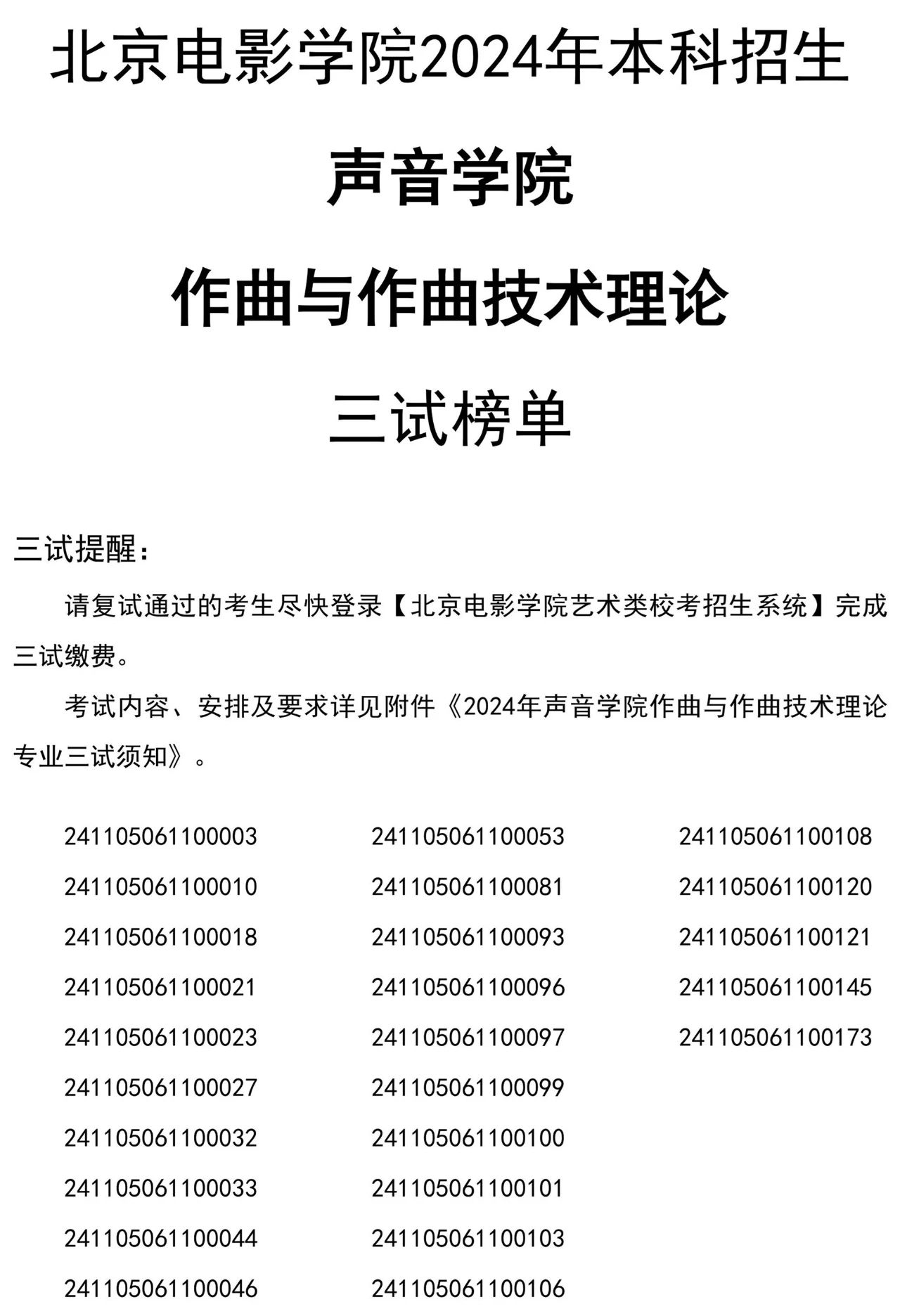 北京电影学院2024年本科校考招生作曲专业三试榜单-