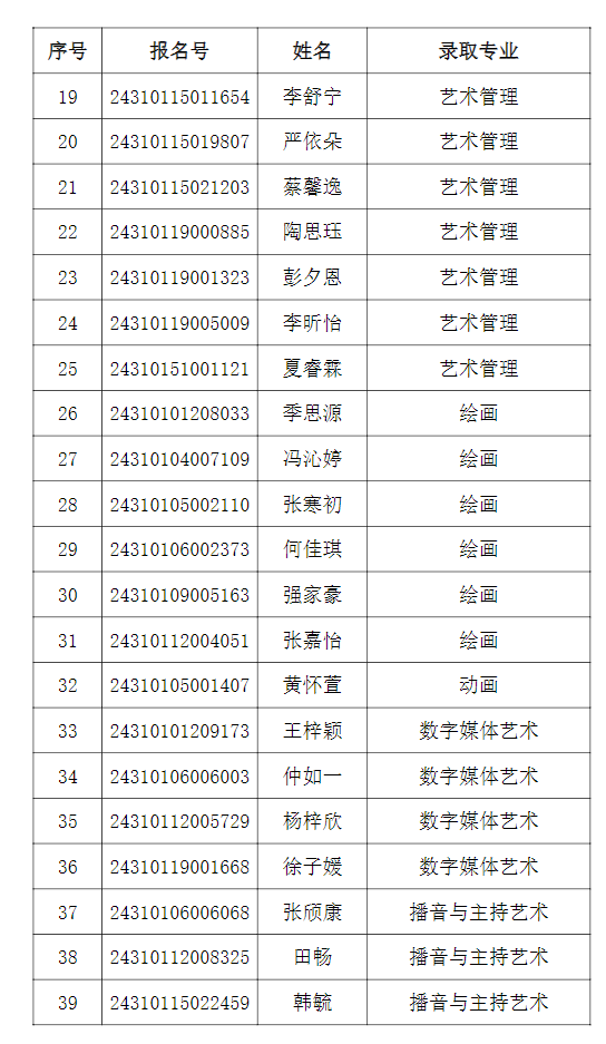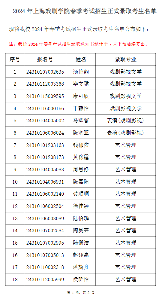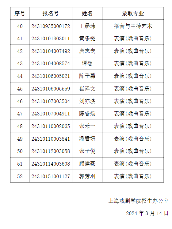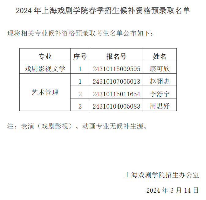 上海戏剧学院2024年春季考试招生正式录取考生名单