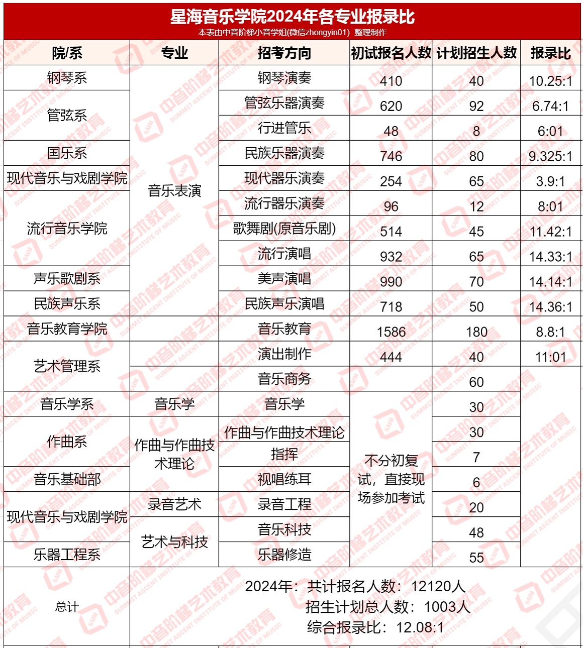 根据2024年星海音乐学院复试名单来看,24年星海音乐学院初试报名总人数为12120+人,计划招生人数为1003人,2024年综合报录比为:12.08:1