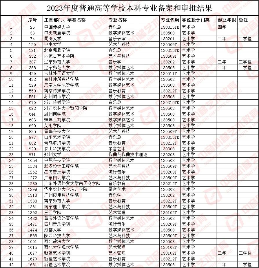 其中,新增备案专业点1456个、审批专业点217个,调整学位授予门类或修业年限专业点46个。涉及艺术学-音乐类专业有星海音乐学院、四川音乐学院、中国传媒大学、中央戏剧学院、新疆艺术学院、内蒙古艺术学院、浙江传媒学院、同济大学、北京语言大学等42所院校,涵盖:音乐学、音乐教育、音乐表演、流行音乐、录音艺术、艺术管理、音乐剧等10个专业。