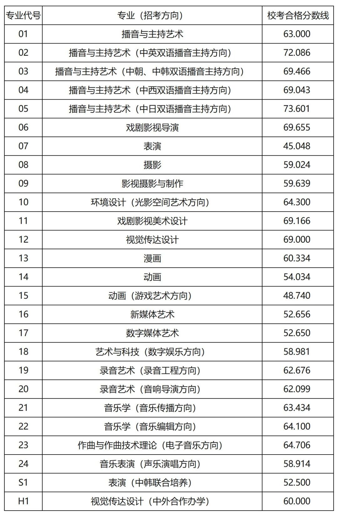 中国传媒大学2024年本科招生考试校考合格分数线