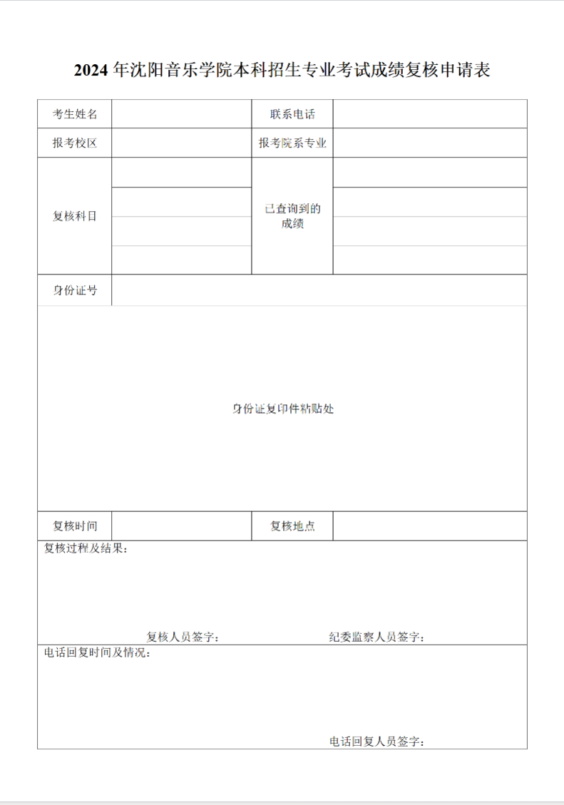 考生如对成绩有异议,可自行下载并按要求填写《2024年沈阳音乐学院本科招生专业考试成绩复核申请表》(可至页面下方下载附件),于2024年4月22日—24日(9:00—17:00)传真至024—23894405,逾期不予受理。考生成绩复核工作将在我院纪委(监察专员办公室)的监督下进行。复核结果将电话通知考生,请保持电话畅通。复核工作只复核漏评、登分、统分或分数累计错误,不包括评分、评卷宽严。