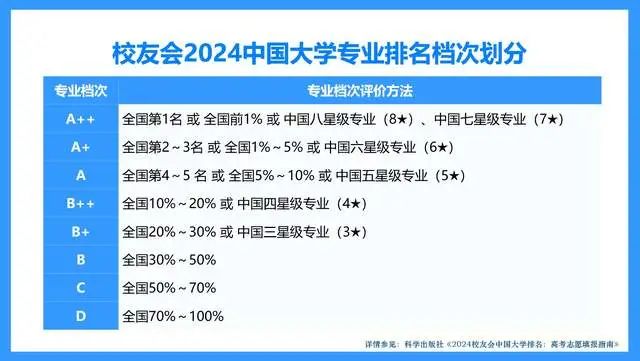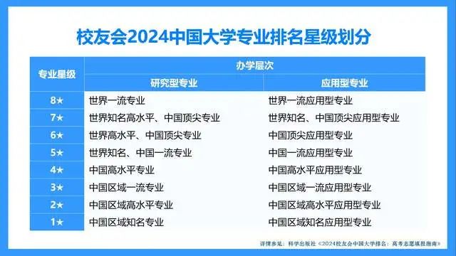 校友会2024中国大学一流专业排名坚持实施分类分级分档评价,依据中国大学办学定位、学科专业建设水平和本科专业发展定位,按研究型和应用型2个类型进行评价。2024年世界一流专业(8★)、世界高水平、中国顶尖专业(7★和6★)、中国一流专业(5★)行列。依据中国大学专业排名位次、位次百分比与星级排名,将中国大学本科专业分为A++、A+、A、B++、B+、B、C、D等8个档次。