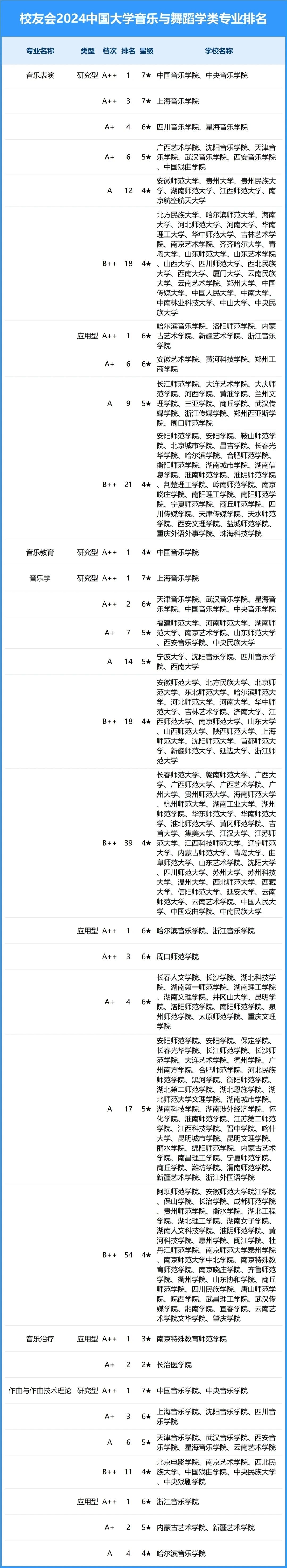 音乐学专业,研究型A++专业为中央音乐学院、中国音乐学院、上海音乐学院、天津音乐学院、武汉音乐学院、星海音乐学院;应用型A++专业包括:哈尔滨音乐学院、浙江音乐学院和周口师范学院。