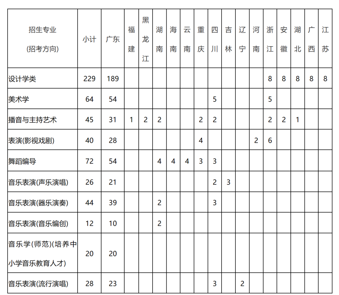 艺术学院招生计划为135人,其中广东招43人,包括音乐学5人,音乐表演(器乐) 25人,音乐表演(声乐) 7人。