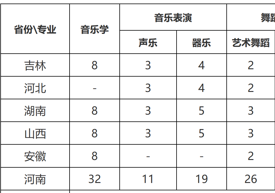 第二,在各省名额分配上,重新划分各省名额。以音乐学专业为例,增加河北省音乐学的生源名额6人,山东省6人,吉林、山西、安徽省名额削减至6人。