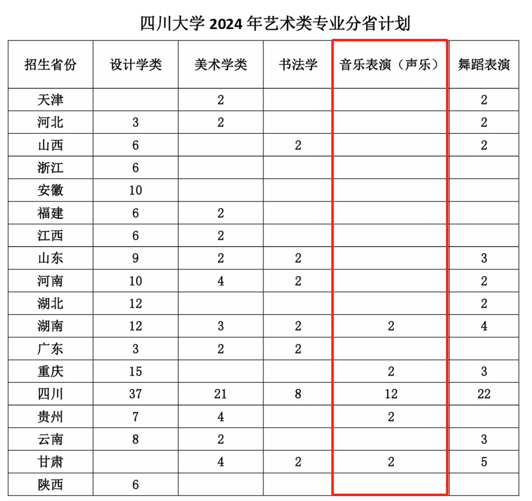 四川大学多个省份招生缩减,湖南、重庆、四川、贵州、甘肃等多个省份招生名额缩减,学校对把控音乐生的生源质量要求提高。
