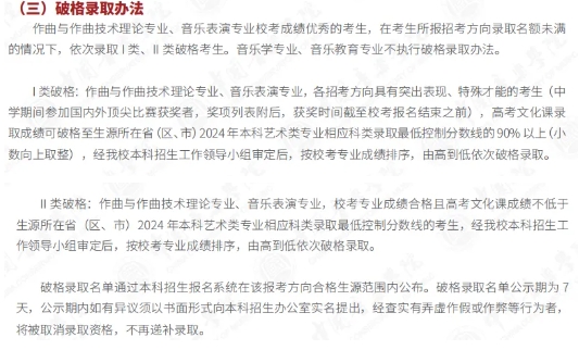 2024年校考院校按照1/3、1/4、1/1.25的比例发放校考合格证,文化分需过普通类本科分数线,按照文过专排方式录取生源。在所报招考方向录取名额未满的情况下,校考成绩合格且文化课成绩不低于生源所在省份本科艺术类专业最低控制分数线的考生,按校考专业成绩由高到低排序,依次破格录取。