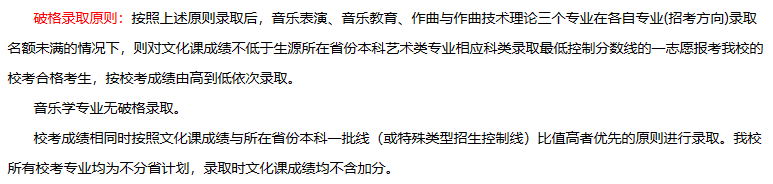 根据中央民族大学2024年艺术类专业录取原则来看,音乐表演、音乐教育、原因月薪、作曲与作曲技术理论专业要求文化成绩过普通类本科分数线,按照专业成绩由高到低依次排序录取。其中音乐表演、音乐教育、作曲与作曲技术理论3大类专业在招生名额未满情况下采取“破格录取”资格,文化要求过艺术类本科分数线,按照专业成绩由高到低依次排序录取。
