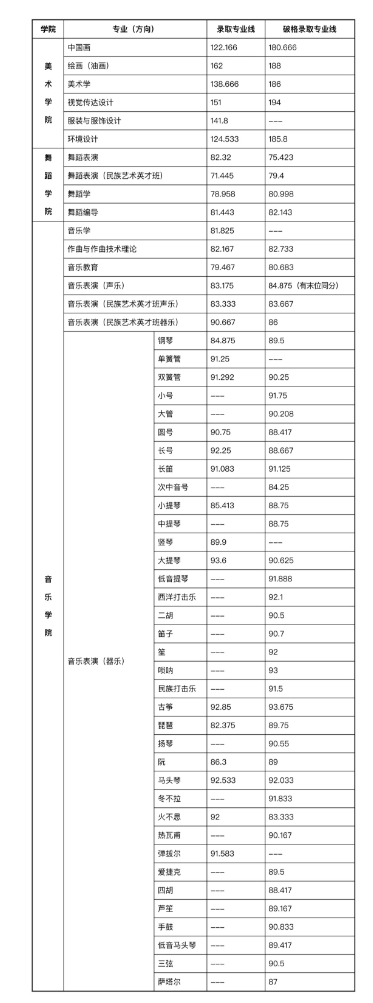根据教育部及国家民委相关文件精神,结合我校艺术类招生章程、各专业(方向)计划招生数以及考生报考情况,对相应子科类省统考本科合格、文化课成绩达到生源所在省份普通类专业本科批次录取控制分数线的一志愿报考我校的校考合格考生,按校考成绩从高到低排队录取。
