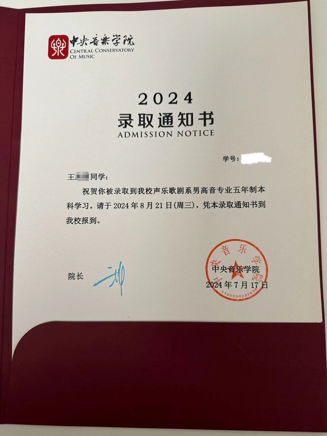集训。经过9个月的集训,我成功考上了中央音乐学院声乐歌剧系,并且取得了男高音第九名的好成绩,文化512分,同时也拿到了星海音乐学院、西安音乐学院、沈阳音乐学院的校考合格证,这对我来说出乎意料的,也是意外之喜,但我真的做到了!