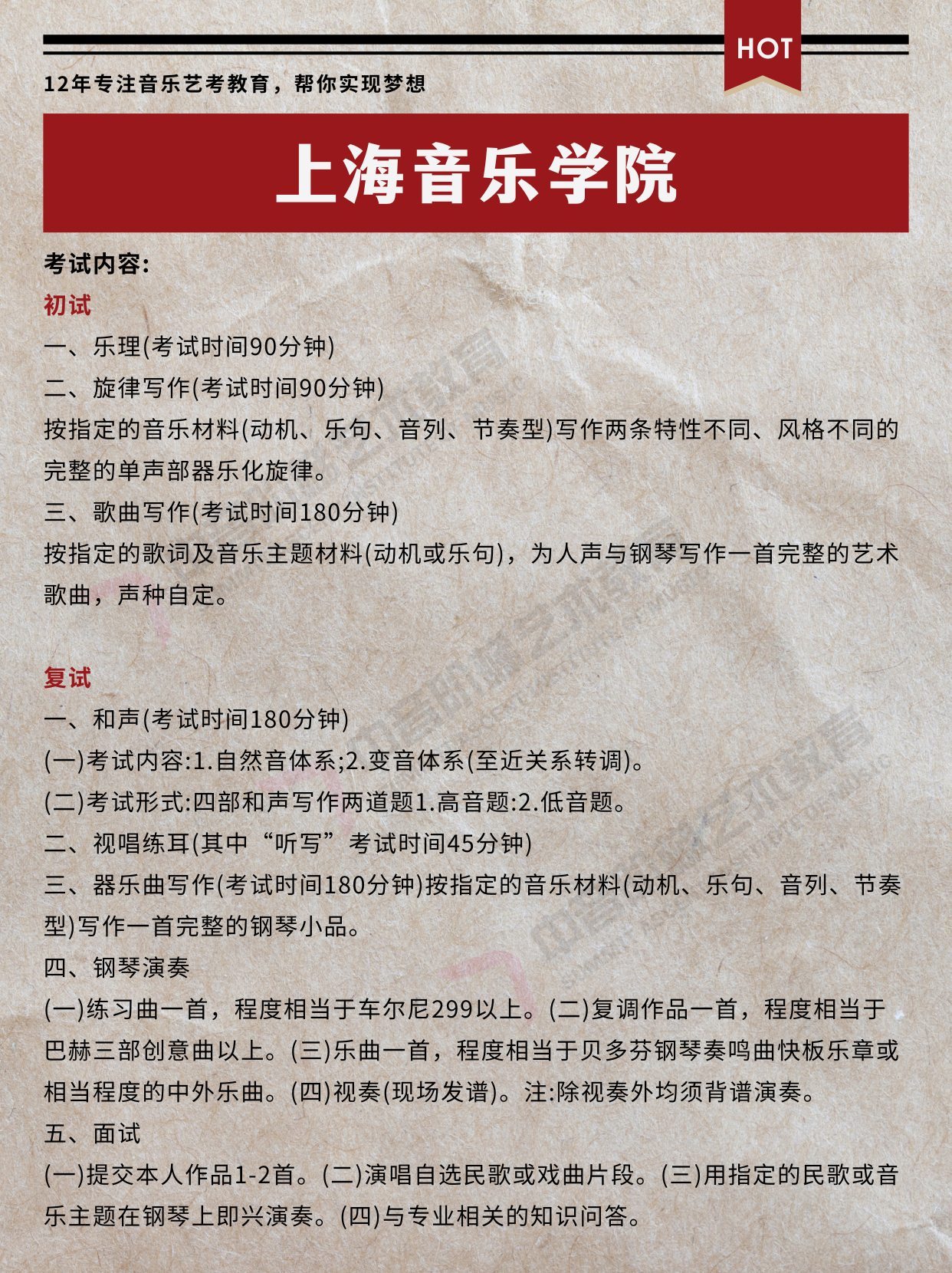 备考重点:钢琴或其他乐器技能、和声曲式、视唱练耳、乐理、作品分析和创作。作曲专业起点高,除了指挥专业之外,作曲专业考察学生对音乐的解读和音乐的修为,是音乐学院考学高难度的专业之一。