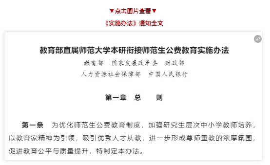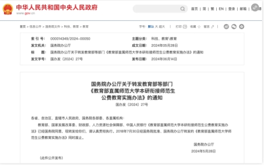 近日,国务院办公厅转发教育部等部门《教育部直属师范大学本研衔接师范生公费教育实施办法》[2024](以下简称《实施办法》)。