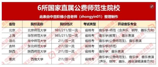 如今,国家教育部正式发布“本研衔接师范生公费教育”这一利好政策,让以前只能申请在职研究生的音乐生,现在可以直接申请全职研究生,不仅大大提升了学历的含金量,而且不用承担考研激烈的竞争压力,两全其美。不过有意向报考这6所国家公费师范生院校的音乐生需要注意:在大三结束后需要进行考核,考核必须要达到保研标准才能继续升学读研哦。所以大学期间的课程学习一定不要偷懒!小音老师为大家整理了国家直属6所公费师范生院校和省属师范院校,历年分省招生计划人数、报告条件、往届录取分数线。点击下方图片立即免费领取↓↓↓