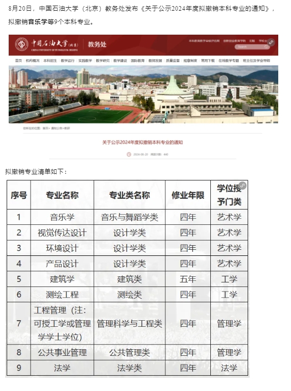 8月20日,中国石油大学(北京)教务处发布《关于公示2024年度拟撤销本科专业的通知》,拟撤销音乐学等9个本科专业。