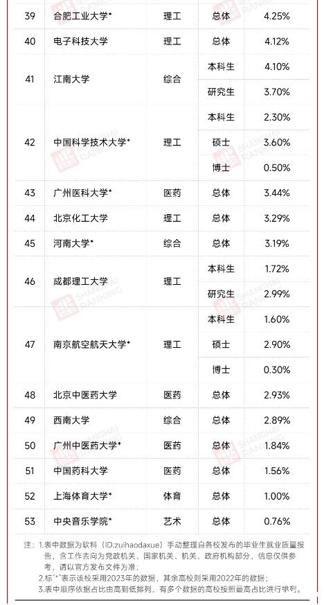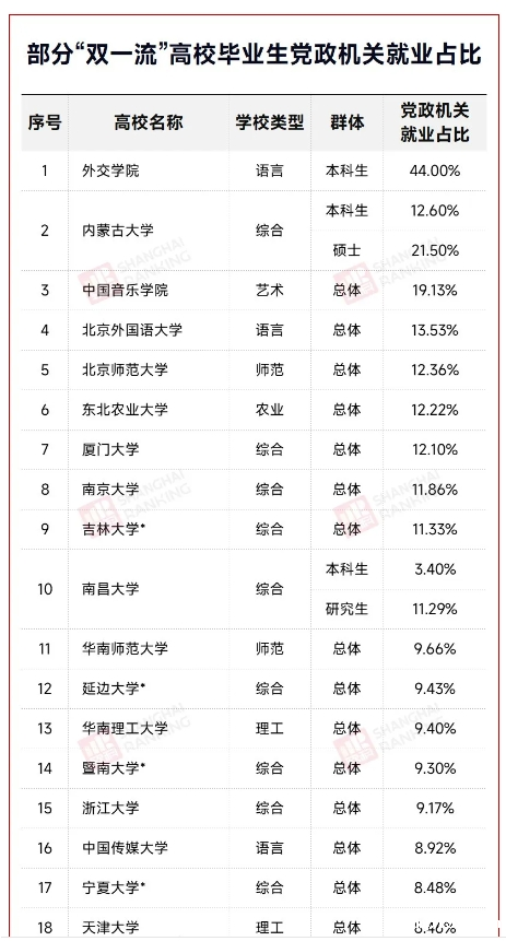 根据全国高等教育评价机构软科发布的部分“双一流”高校毕业生党政机关就业占比得知:艺术类高校中,中国音乐学院毕业生在党政机关就业占比达19.13%、中国传媒大学8.92%、中央音乐学院0.76%等等。