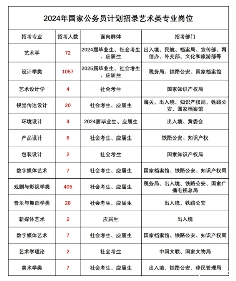 统计发现,2022年度国家公务员计划招录的3.12万人中,艺术生可报考的岗位265个拟招录522人,招录人数同比增长20%以上。2023年度国家公务员计划招录的3.71万人中,艺术类专业可报考的岗位共有697个拟招录1578人,较2022年增幅达202.29%。而到2024国家公务员计划招录的3.71万人中,艺术类专业可报考的岗位共有697个,拟招录1578人,较2023年的265个岗位拟招录522人大幅增长了1056人,增幅达202.29%,按这个趋势看今年招收人数将会更多!机会难得大家提前准备!